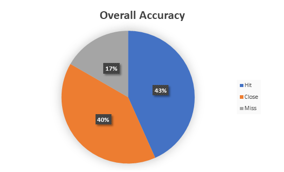 | Overall accuracy. (Calculated by adding all the scores together.) | • Hits: 13 = 43%. • Close: 12 = 40%. • Miss: 5 = 17%. |