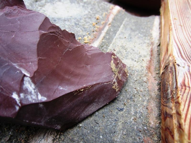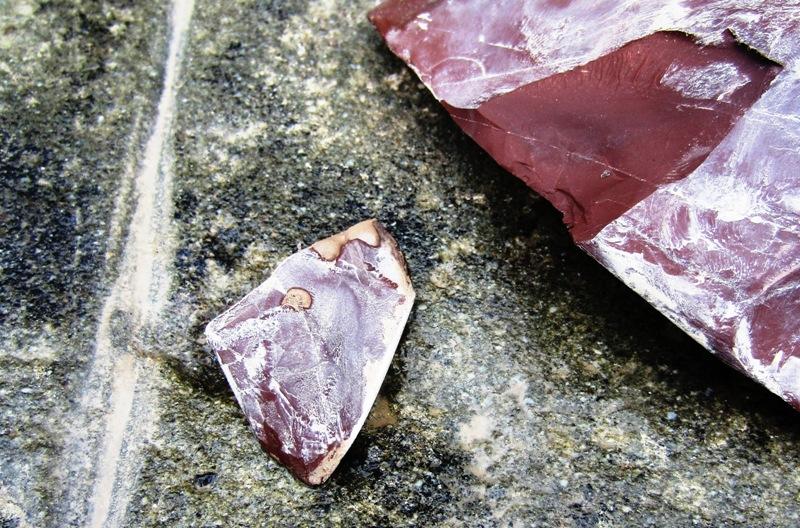 Red jasper is a sedimentary rock composed of siliceous skeletons of unicellular (radiolar) marine micro-organisms. It contains small amounts of iron and manganese oxides that provide the colour red. Jasper is also quite common here (Campana, Maggi and Negrino, 1998; Maggi 1998). The working of the statue was almost a battle between jasper and quartz because they have about the same hardness, around 7 on the Mohs scale (See Figure 3).