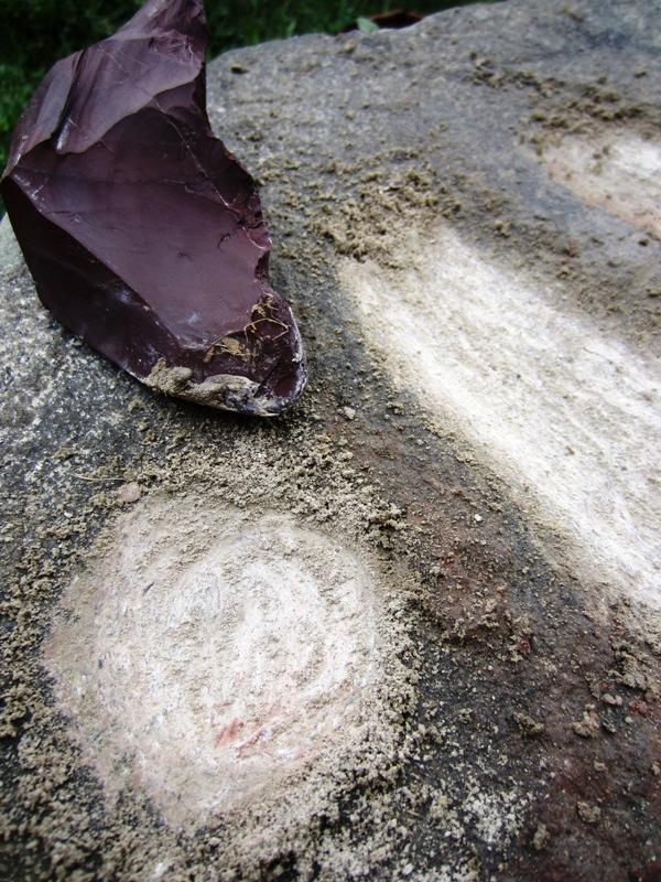 The surface to be worked was not perfectly flat and some bas-reliefs, such as the circles representing the ears or perhaps the earrings did not become symmetrical. Using scrapers and jasper chisels I tried to make the statue as symmetrical as possible. I could not remove all millimetres thick with the risk that some new piece of stone would come off and I would try to smooth the surface again. The incision with a jasper burin was used to trace the lines of the areas where to remove material. It was difficult to make the first furrows, especially if curved. The jasper instrument slipped and was pressed hard with the weight of the shoulders. For straight lines I helped myself with a wooden board. Even the jasper required sanding during use, and it was necessary to chip it several times to make it sharp again (See Figure 8).