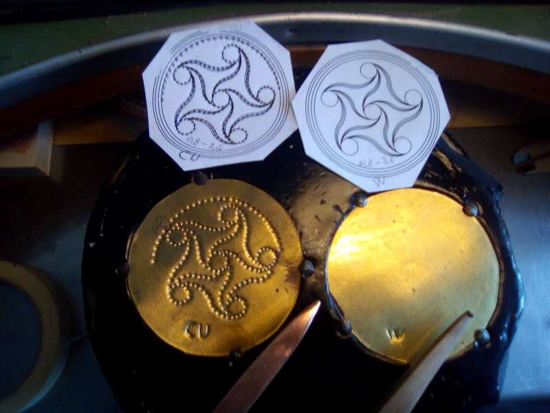 Once the plate is firmly held by the pitch, front side up, the outline of the desired design is lightly chased on it by a thin and sharp tool (a liner), that creates narrow raised lines on the other side.