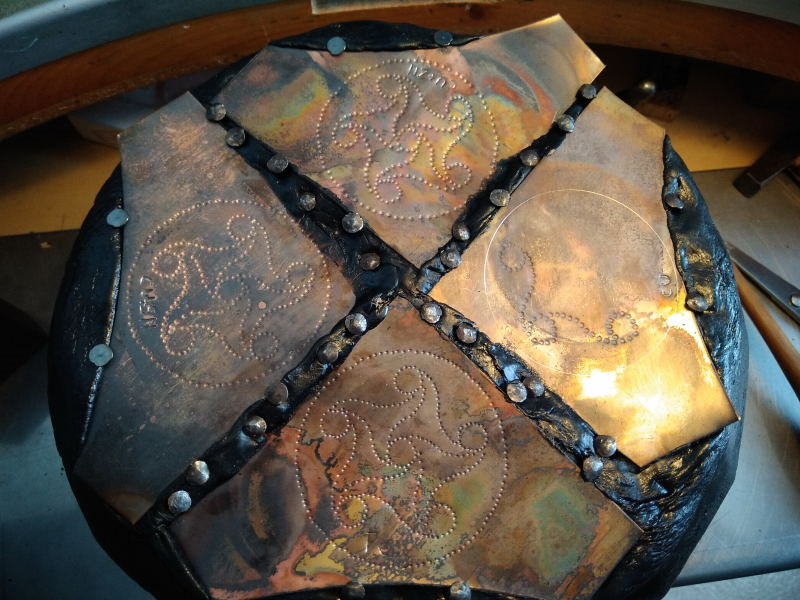 When the chasing phase is complete, the metal sheet is turned over, and firmed again over the pitch, with the back side up. The main repoussé work is then performed, using a variety of punches.