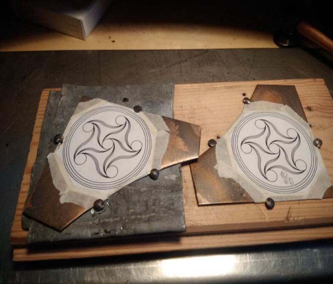 The metal plate needs to be secured on an appropriate support; a quite common technique is to set the metal sheet over a layer of chasers’ pitch, that has been heated until is soft enough to adhere to the metal leaf - holding it in place – but is still plastic enough to decrease the metal resistance.