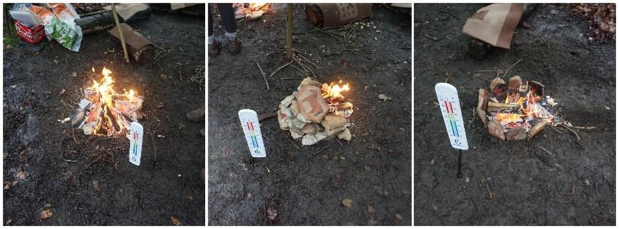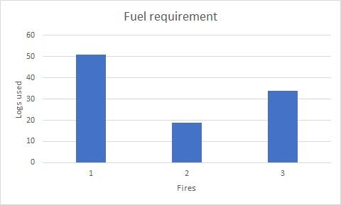 The three fires were lit at the same time, using incrementally larger fuel as the fire developed, eventually fuelling each configuration with kiln dried birch logs, to maintain consistency throughout the experiment. Logs were chosen at random and fed into each fire as required to maintain burning. For the purpose of this experiment and to maintain consistency in recording fuel usage, a log was defined as a piece or pieces of kiln dried silver birch approximately 20 cm in length and weighing 1 kg. Thermometers were positioned next to each fire at a distance of 50 cm to record ambient temperatures, these temperatures were logged at 1-hour intervals throughout the 5-hour duration of the experiment. Temperatures in the heart of each fire and the plaquettes themselves were also recorded at intervals using a laser thermometer. In addition to these recordings, a separate thermometer was positioned, level with the other static thermometers, 20 meters distant from the fires as a control.
