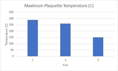 The internal temperatures of configurations A and B both exceeded 550°C during the experiment, with configuration C reaching a maximum of 523°C. The maximum temperature reached by the plaquettes is shown in Graph 3. Again, the open fire shows the highest temperatures, however in this case the difference between configurations A and B is considerably less than the ambient temperature seen in Graph 2. This shows that the plaquettes are able to reach extreme temperatures even in a fire that appears to provide considerably less heat. Added to this recording of maximum temperature, the temperature variation across the plaquettes, particularly in configuration B were measured throughout the experiment. The large plaquette placed as a capstone on configuration B was shown to increase from just 44°C at the outside edge, to 260°C in the centre above the fire. This significant variation in temperature across a single plaquette was also recorded on examples in the open fire with temperatures increasing from 150°C to 290°C depending on proximity to the centre of the hearth.