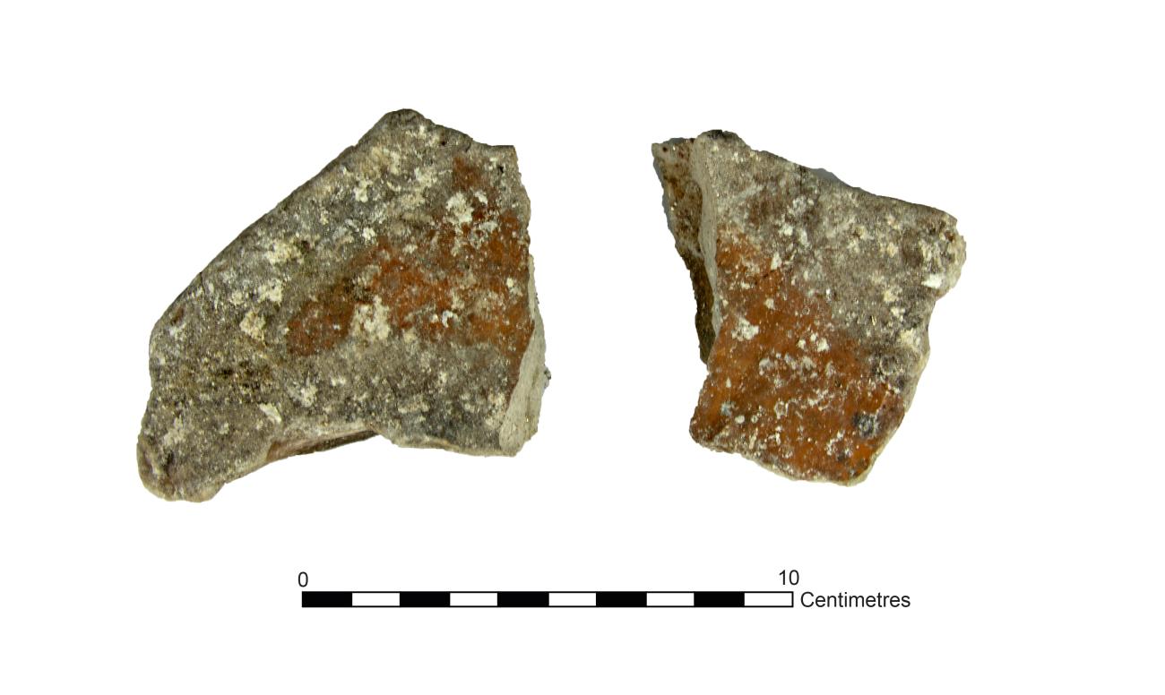 Cracking was observed in plaquettes in configuration B from two hours into the experiment. A crack in the large capstone in particular could be visibly seen to open and close with the addition of fuel and subsequent increase in temperature. No examples from configuration C could be seen to crack and similarly cracking was difficult to observe in configuration A as the plaquettes were mostly obscured by the spreading embers and ash. The most common colour changes that were visible were the blackening by smoke of plaquettes in configurations B and C. Only a single plaquette placed in configuration A showed colour change somewhat similar to archaeological examples, which had changed to a pinkish orange colour in parts (See Figure 4). This plaquette had like the others in the same configuration, eventually become engulfed by the spreading hearth throughout the experiment and was therefore in a far hotter part of the fire than any plaquette in the other two hearths.