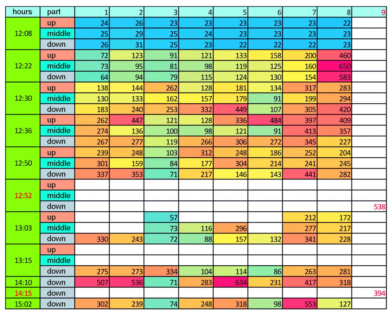 The statistic analysis2 of the resultant temperatures correlated in time allowed us to highlight the points of peak temperatures. The first was documented after about 20 minutes of burning, reaching a maximum of 650°C (See Figure 10b), the intensity of the temperatures on the plan at different points was followed for about 3 hours (See Figure 11a-b), which allowed the analysis of the temperature dynamics.