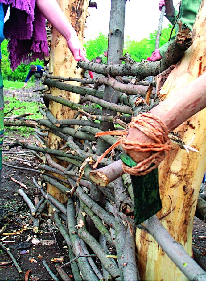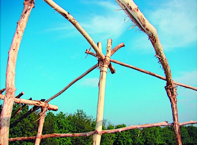 The next stage of the experiment consisted of joining the vertical posts with horizontal beams marking the outer walls and the roof casing, thus finishing the wooden frame of the dwelling (See Figure 4a-b).
