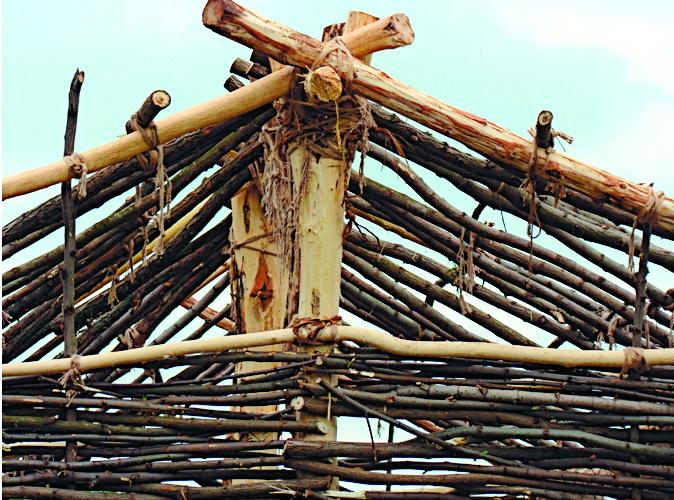 The first stage of the experiment consisted in raising the wooden frame of the dwelling, matching the planography, dimensions and location of the post holes, as well as the orientation of the dwelling-model. For this purpose, on the entire perimeter of the dwelling surface was dug with post holes of 0.3-0.4 m diameter and 0.5 m depth, in which they were buried at a certain distance vertically and which were to outline the frame of the dwelling. The chosen posts were made from trunks of trees (acacia, elm, oak or horn) from the nearby forest, with various diameters, between 0.25-0.3 m, corresponding to some burnt posts discovered during excavations from Saharna-Ţiglău. To support the roof posts which were located through the middle of the dwelling, large pits were dug on the long side, similar to the observations of Building 1 from Saharna-Ţiglău, which involved a roof in two slides (See Figure 2). The post holes were filled with gravel and earth, and the posts were pounded into place with wooden hammers. The entire structure was tied with cords made of lime bark prepared at the time or with cords made of linen (See Figure 3), in total, approximately 300 m of cords were used during the experiment.