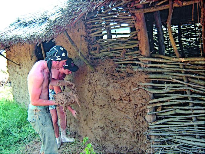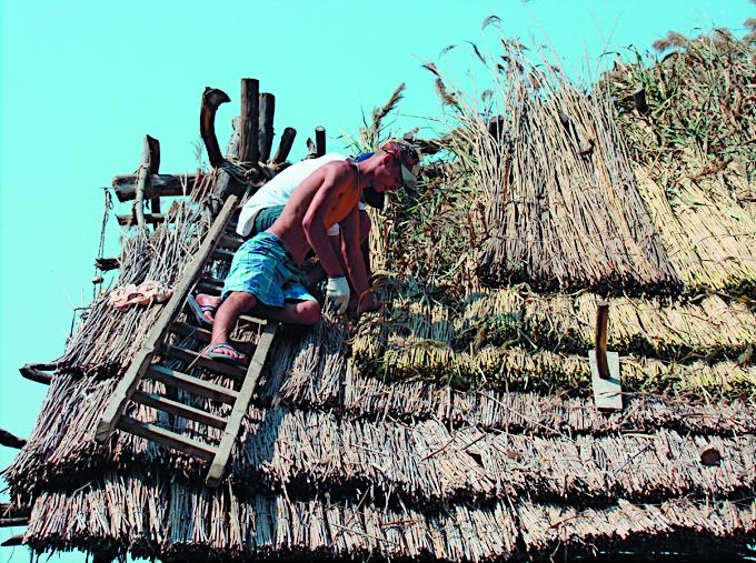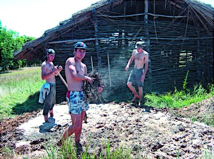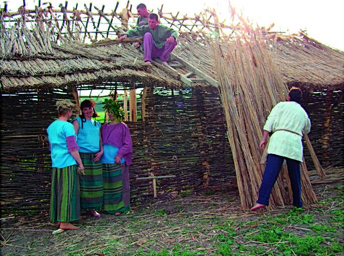 The next stage consisted of laying the reed roof in several episodes in the spring of 2008 - autumn 2009 along with covering the walls with clay (May, July 2012). The process of reinforcing the walls with a thick clay layer were consistent with the archaeological data, which gave us some details about the clay composition and the thickness of the daub which was approx. 4-5 cm and required about six tons of clay, straw and 500 liters of water (See Figure 6a-f). The reconstruction of the roof has caused several discussions. For the raw material, it was decided to use reeds, as the arguments for this selection has been supported by the ethnographic data, and its abundance in the Dniester meadow - a situation probably not changed since prehistoric times (See Figure 5a-b). For the roof and wall installation, approximately 1700 reed bundles were used.