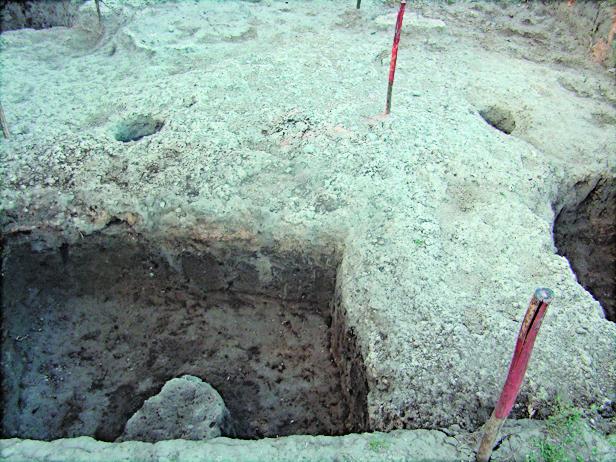 - Controlled burning of the reconstructed dwelling (documenting thermal oscillations) has allowed the recording of the various processes of burning and preservation the remains of the material culture in situ, thus explaining the nature of the formation of some archaeological realities that could be interpreted with ambiguity. For example, we managed to explain the presence of some pits in the platform of the surface dwelling researched at the Saharna-Ţiglău settlement (See Figure 9a-b) (Niculiţă and Nicic, 2014, pp.19-20, 312, Figure 97), which gave the impression of being dug after the dwelling was no longer in use. Experimentally, it has been shown that during the collapse of the burned construction, these wooden posts did not burn completely and remained standing for a short time and were "handcuffed" in the smoldering ruins of the construction (See Figure 9e) (Niculiţă and Nicic, 2014, p. 312, Figure 97: 5a-b, 6-7). With the collapse of the ruins and the rotting of the base of the posts, a void was created (Figure 9h) which, in turn, was filled with subsequent deposits, leaving the impression that the posts were "beaten" in the soil to the sterile loess, perforating the platform layer of the compact ruin in this area and, in part, the sterile layer (Niculiţă and Nicic, 2014, p. 312, Figure 97: 1-2).