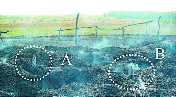 After about 12 months from the date of the fire, the ruins of the building were still visible, clearly showing the outline of the dwelling. On the surface agglomerates of burned clay with branch prints and carbonized pillar fragments were visible along with the interior structure of the burnt dwelling (See Figure 9h). Remains of the burnt clay walls were mostly concentrated on the outer perimeter of the dwelling, having a thickness of about 20-40 cm at the current stepping surface, encircling the perimeter of roof burning residues. There were interesting observations related to the context and the preservation of the construction posts. After the complete burning, the contours of some posts on the perimeter of the dwelling were outlined (See Figure 9h). Some posts from the wood frame, did not burn completely and they stood for a short time being consolidated by ruins. This can be explained by the process of the preservation of the ruins of the dwelling at the time of the collapse when it was burned, (See Figure 9e-g). With the collapse of the ruins and the burning or complete rotting of the base of the pairs, the holes in which they were placed were emptied (See Figure 9g-h). As evidenced by the archaeological context of Saharna-Ţiglău Building 1 (Niculiţă and Nicic, 2014, pp. 19-25; p. 312, Figure 97: 1-2, 5a-b, 6-8), they were filled with later deposits, leaving the impression that the posts were "beaten" in the soil down to the sterile loess, thus perforating the compact layer in this area, as well as the ruin platform, and, partially, the sterile layer (See Figure 9a-b).