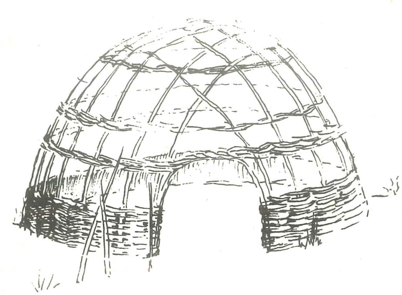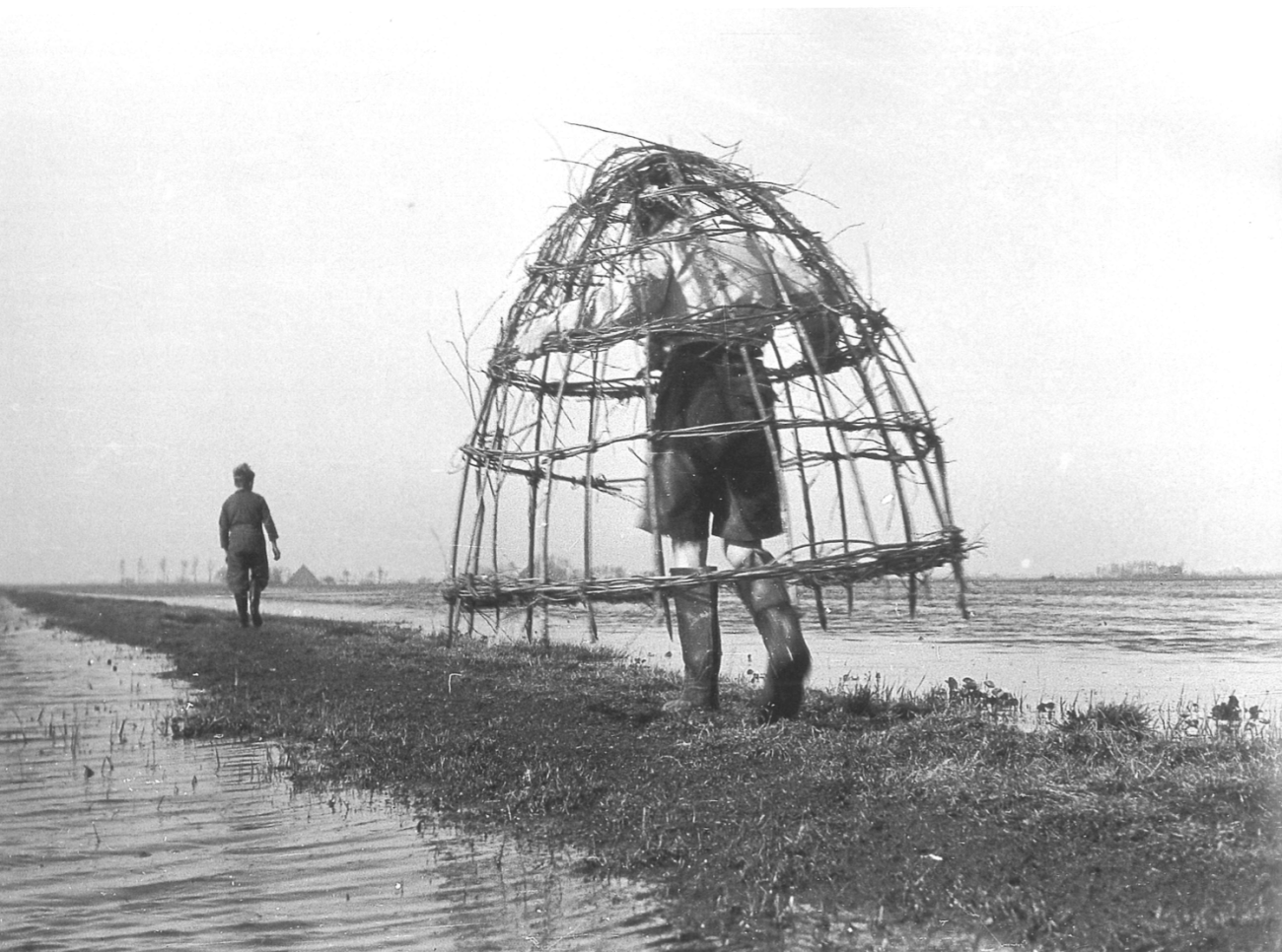 These huts had been inspired by shelters built some 30 years earlier. For some time during the Second World War (1944-1945) Roeland and Hans Horreüs de Haas had gone into hiding in a farm in the province of Friesland. The area was largely flooded and difficult to reach. Once spring arrived, they went out to observe the birth of birds. To avoid scaring off the birds they took shelter in a domed hut that they made with branches of willow covered with reeds (See Figure 12; Horreüs de Haas, 2004, p.84). Clearly, they had gained experience with the construction of lightweight, dome-shaped huts made of flexible branches and reed here, not surprisingly the same kind of materials used many years later during the Living Experiment (Pomstra, 2012).
