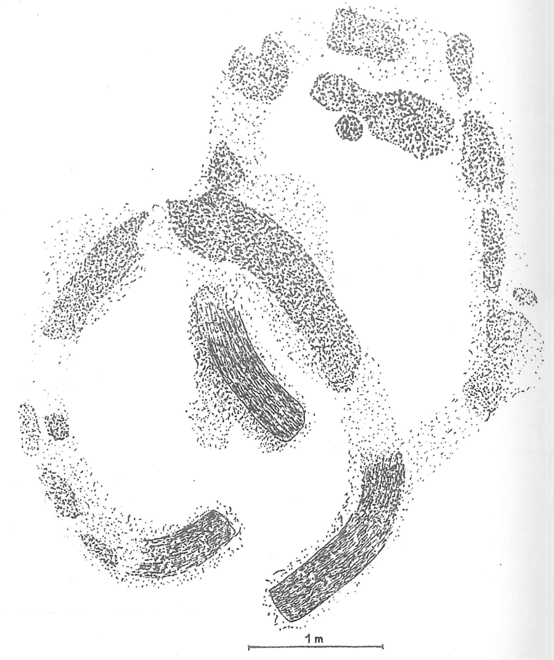 It was found next to the so-called Bergumermeer lake, and yielded numerous finds. Most curiously, the excavators also discovered several horse-shoe shaped orange discolourations. These were interpreted as the remains of five or six more or less contemporaneous dwelling structures, or huts (See Figure 3). Hardly any postholes were found but the excavators did find a number of large āstructuralā stones that were supposedly used for reinforcing the huts. The orange patterns are on average 7.7 m long and 4.6 m wide.