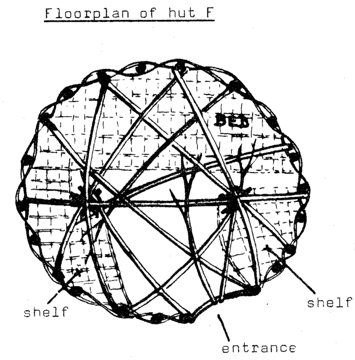 During the experiment, huts of various shapes and sizes were built, though the participants quickly observed that it were the light, round and oval huts with ābraidedā domes that could defy bad weather and wind best (Horreüs de Haas and Horreüs de Haas, 1982, p.144). The design of Hut F in particular seem to have survived the test of time, and likely served as inspiration for the Archeon huts in the early 1990s (See Figures 8-11; paragraph Source 4). It is relatively small, with a diameter of ca. 3 meters and a height of 1.50 meters. Just like the later huts at Archeon, it was built with a low wall of wickerwork, after which long sturdy willow branches were led diagonally towards a central axis.