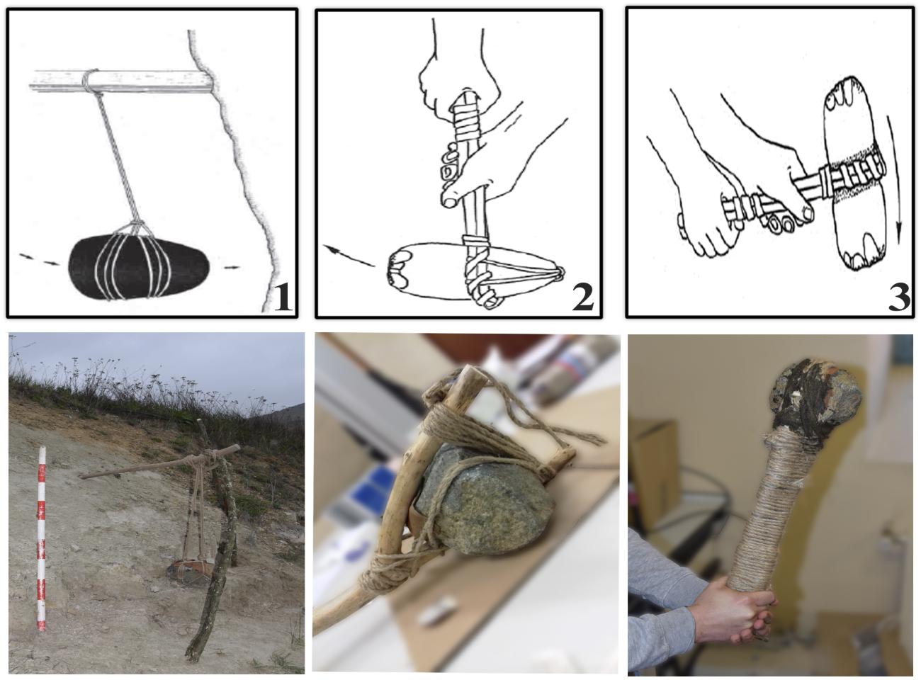 The main aim of this experiment was the replication and use of hafted dolerite hammer stones, in order to understand the archaeological dolerite sets: both the surface finds around Sierra de Araico-Cucho and the archaeological finds recovered at Pozarrate. Unlike the surface collection (with evidence of standardization and much more polishing features), the Pozarrate dolerite set shows simple technological modifications (generally notches) to adapt lithic blanks to hafting and mining work. The morphotechnic similarities of other prehistoric and metalliferous mining environments (e.g. Blas Cortina, 2007-2008; Delgado Raack et al., 2014) make us think that these surface maces may belong to a post-Neolithic period. Therefore, we chose to reproduce the archaeological set, taking into account its weight and technological improvements, and designed different mining tools accordingly with three extractive strategies: a rigging device, a single-end hammer of medium weight and a double-end hammer of light weight (Blas Cortina, 2007; Timberlake and Craddock, 2013 p. 44-45).