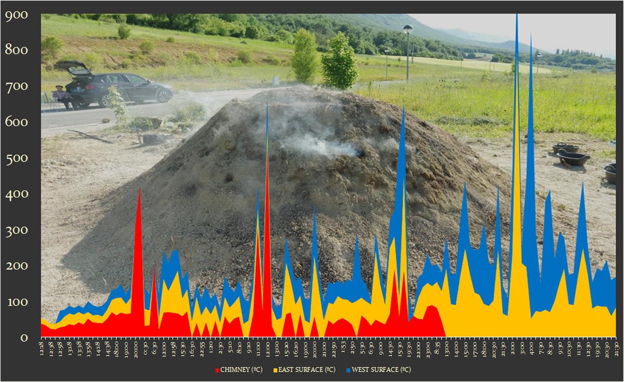We were able to take advantage of an ethnographic experiment on Basque traditional coal production performed on June 2018 during a week in Bernedo, Álava (Basque Country, Spain). Despite not being an experiment focused on our goals, we believe that the conditions of time and temperature would be similar to those used in the extraction of flint nodules from Pozarrate. Due to the long duration of the experimental process, the temperature of several areas of the charcoal pile was checked with a laser thermometer at intervals. Therefore, several Treviño and similar Botorrita flint flakes (n=21) were placed on the surface at an initial stage of the experiment and recovered by archaeological methodology after the charcoal pile was dismantled (n=13).