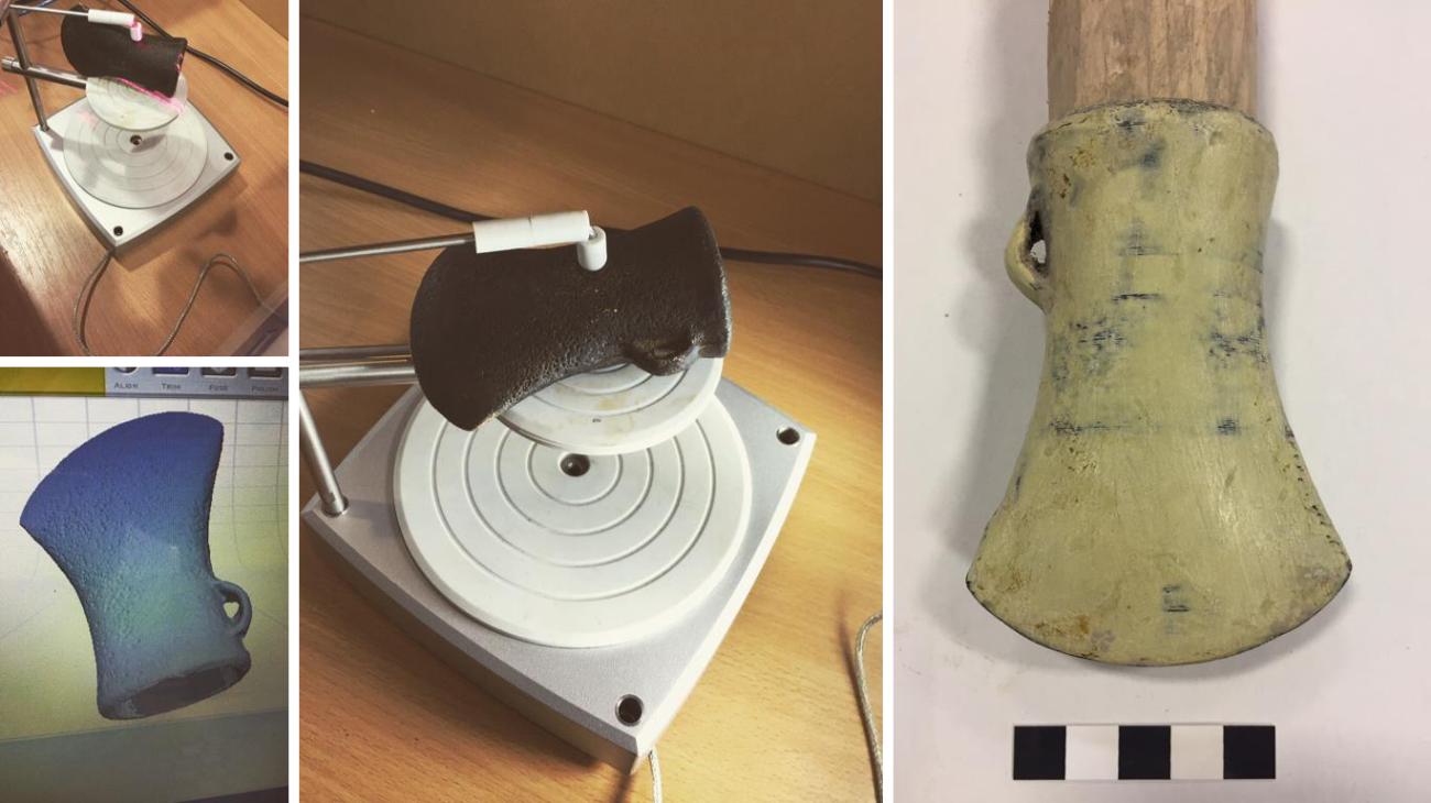Given the available archaeological evidence outlining a profile of the clay moulding process in making bronze socketed axes, two theoretical possibilities for creating the internal rib formed the basis for my experiment. A total of 12 clay moulds were created using a 3D printed model of sample socketed axe No. UCD 2498. This socketed axe retains the classic ‘waisted’ shape of the Class 11A category measuring 68.3 mm in length. Its exterior shows signs of porosity, though its overall form is well defined. Its socket measures 53 mm in depth with a uniform ‘oval’ shape to its dimensions, which flares to the curvature of the blade. The internal rib appears to be sheared in the middle and bent slightly as a result of post-cast processing (See Figure 1, Right). These characteristics, along with the artifact availability in the UCD School of Archaeology Teaching Collection, made axe No. 2498 a prime candidate for replication. The axe was 3D scanned using a NextEngine Laser scanner, and 3D printed on a Flashforge 3D printer. The print was coated in a thin layer of epoxy and fitted with a wooden extension making up the ‘core print’ as suggested by the Tobermore models (See Figure 4).
