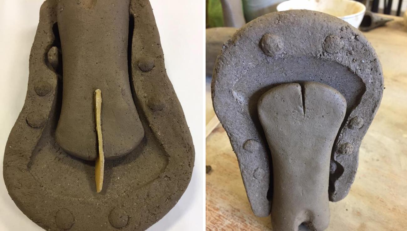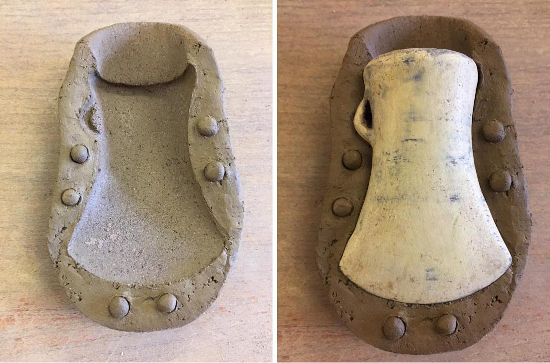 The model was impressed into the valves to halve its thickness and ensure that the clay registers tightly around its form. The area around the matrix on the valve face was indented and fitted with balls of clay acting as registration keys to align both valves (See Figure 5). A number of clay mould fragments used to make socketed axes found at Dalkey Island (Liversage et al., 1967-68) as well as at Jarlshof, Shetland (Hamilton, 1956) and Traprain Law, East Lothian (Coles, 1959-60, p. 89) show similar methods termed ‘lug and socket’ (Ó Faoláin, 2004, p. 39). Because the model had to be removed, a release agent was applied before either valve was imprinted with the model. Evidence for a release agent in this process would be virtually invisible archaeologically, but it is inherent to the valve moulding process to prevent the clay from bonding to the model. Although ground charcoal or soot would have worked as a release agent during an experimental practice in bronze sword casting, fine ash was the most effective (Ó Faoláin and Northover, 1998, p. 71). Once the first valve was impressed and the keys set in place, the mould was left to dry leather hard before informing the second valve of the mould.