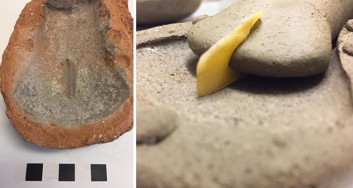 The body of clay moulds from Dún Aonghasa were consistently layered with finer clay on the interior to a courser exterior wrap. Two of the valves were thin sectioned and subjected to a petrological examination (Unitt, 2012, p. 33). The report determined that there were three fabric groups for all ‘ceramic’ fragments found and revealed that the innermost layers of the socketed axe moulds were made up of a well-crushed temper comprised primarily of quartz (up to 1 mm). The third fabric group consisted of only one example containing much larger inclusions (up to 2 mm) at a higher volume. Mould valves from Dalkey Island (Liversage et al., 1967-68, p. 148) and Rathgall (Becker, Personal communication, 25 July 2018) were also reported to have an inner layer consisting of finer quartz temper with a coarse outer wrap.