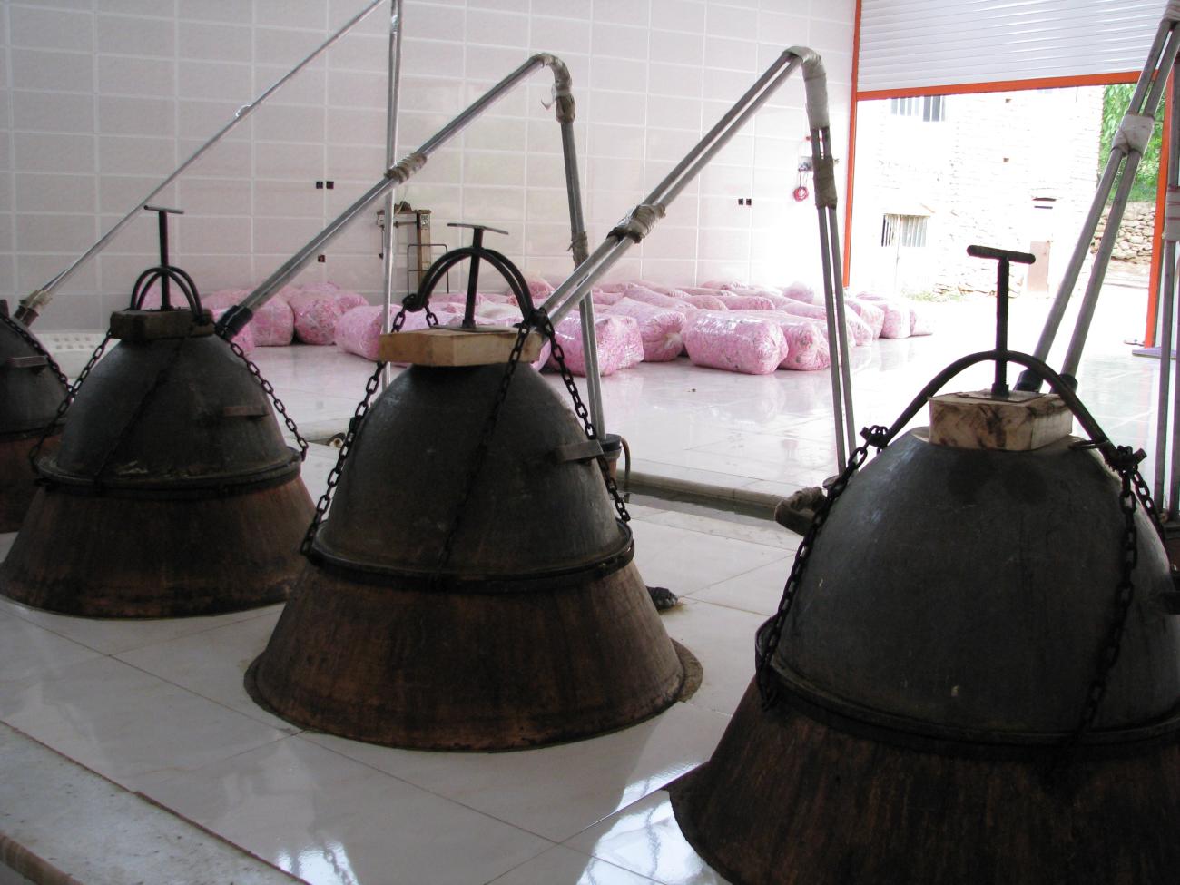 After receiving photos of the Roses festival from Kashan in Iran (See Figures 17 to 20), a last experiment was arranged in which the reeds were placed in the same position as the traditional Iranian alembics (See Figure 16). The experiment demonstrated that the upward-turned reed, connected to another one which was downward-turned, increased the distillation yield.