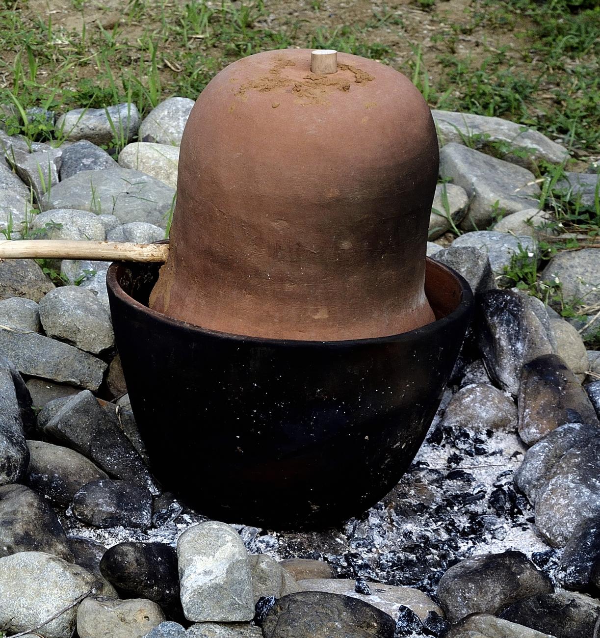 The strainer is a very important element in the distillation procedure. Needham (1980: fig. 1473 C) considers the jar with the perforated base as the main element of traditional Chinese steam-cooking, and from which China's distillation apparatus was invented: “Conjectural design of the most ancient Mongolian Chinese still type. A bowl of cooling water caps the upper vessel (tslng) and a collecting-bowl stands upon its perforated bottom (or, of course, on the grating of a Hsien when the two vessels were combined into one). The li below provides the vapours, and the distillate collects in the bowl, equipped subsequently with a side-tube”.