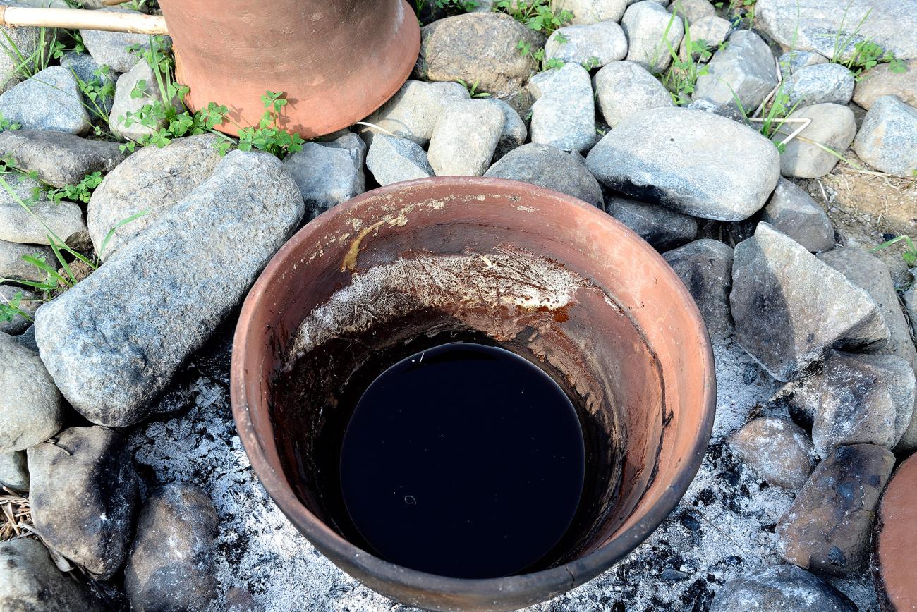 For the first experiment to test the functionality of the second apparatus, we used the replica of the strainer jar n°360 h. 33.6cm, d. 22.2cm, as container to arrange a steam vapor distillation introducing inside pine tree leaves. As a replica of Tepe Gawra channel pots, we have chosen n°406 h. 48cm, d. 53cm (See Figure 13), as the size contains perfectly the strainer jar (See Figure 10). For the cover we made replica of n° 2233 corresponding to the n° 411 of Tobler 1950 Pl. CXLVII (held in the University of Pennsylvania Museum of Art and Anthropology), considering mainly the dimensions of the height and the diameter (h. 30,3 cm d. 38 cm), enlarging the mouth as in the original. A one-meter reed was inserted into the spout to carry out the distillation liquid into a jug positioned outside the circle of stones, and a fire placed around, not under the vase (See Figure 13). After more than an hour the first drop of liquid appeared at the extremity of the barre. Distillation continued slowly for five hours. It was possible to observe that the distilled liquid contained, in addition to aromatic water, some floating essential oil, which was recovered with a dropper (See Figure 14).