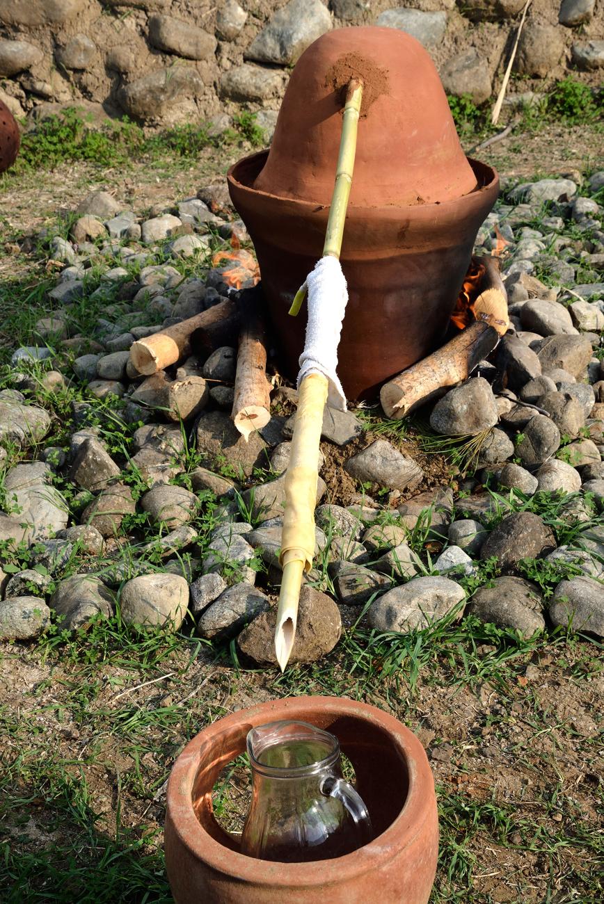 At the same time we were able to verify that a common Arundo donax rod can be used as a condenser to collect the liquid at a certain distance from the fire, and how it can be cooled by wrapping it in wet cloths to accelerate the condensation of the liquid. Direct experience has shown how important the distribution of fire around, and not under, the apparatus was - gradually increasing the heat without the risk of fractures of the ceramics, respecting the recommendations of the experts that neither alcoholic drinks nor essential oil exceed 100 degrees of temperature. The alcohol in fact vaporizes at 70 degrees and the essential oil is dispersed in the vapor after 100 degrees.