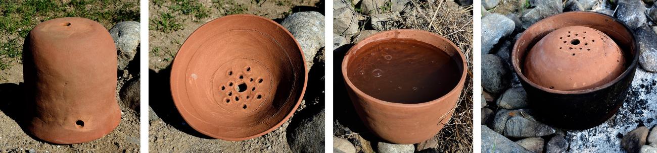 The experimental process began with the reproduction of the pottery and this operation allowed us to observe the details and the difficulties faced to make them without the use of the lathe with adequate characteristics to withstand a temperature suitable for boiling liquids. The next phase concerned the assembly of the vessels that could form an apparatus by moving the hypothesis from theory to reality within the limits of the compatible dimensions of the individual objects. This operation allowed us to understand how important some additional elements were, such as the internal filters, which are accessories present in modern distillers, and the quantity of vegetables and liquid they could contain.