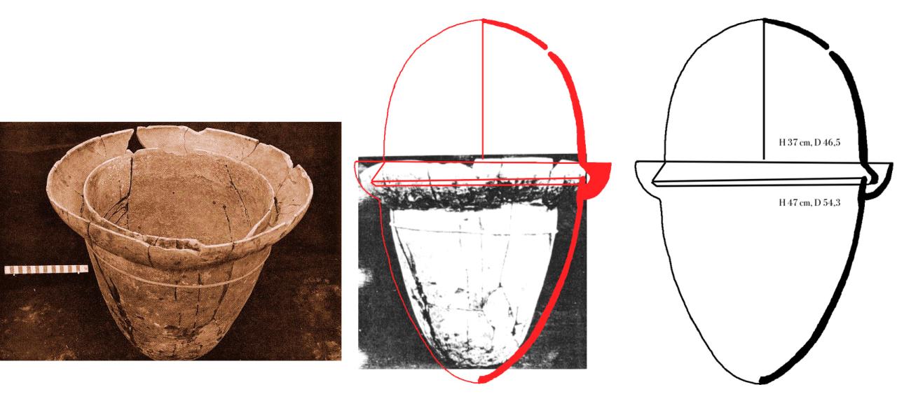 Since, for almost a century, the top piece of the vessel (lid or cover acting as the expansion vessel) was considered lost by the directors of Tepe Gawra excavations (Speiser (1935) and Tobler (1950), different hypotheses were made about its shape. J. Ryšánek and V. Václavů (1989, p. 199, fig.3) offer an illustrated reconstruction (Belgiorno 2018, 59 fig. 29), while the Chemicals Museum of the University “La Sapienza” of Rome presents clay models (Belgiorno 2018, p. 45, fig. 16).