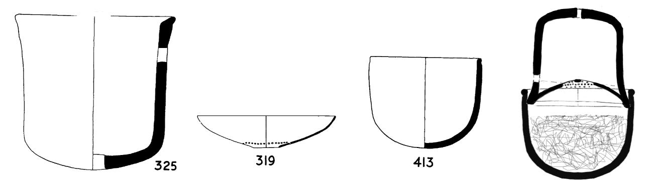 In our review of the published material, we also found a second device composed of three pieces (from levels XII-XIA) which present matching dimensions and diameters. These pieces correspond to the Middle Chalcolithic period, i.e. the oldest phase of the site. The device consists of a deep bowl (n°413 h. 25.2 cm, dm. 30.8 cm; Tobler 1950: p. 240, Pl. CXLVII, rough brown ware: G5: level XI, 7M) which has the correct dimensions to contain strainer basin n°319 (h. 7,5 cm, dm 24,2 cm; Tobler 1950: p. 238) and the bell-shaped pot n. 325 (h. 22 cm, dm 22.8 cm; Tobler 1950: p. 238) with two holes of which one is situated in the bottom and the other on the side under the rim (See Figure 3).
