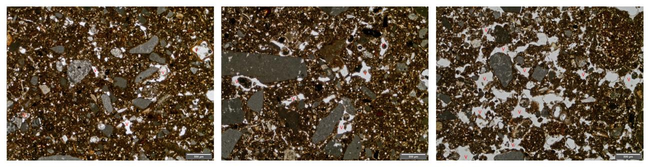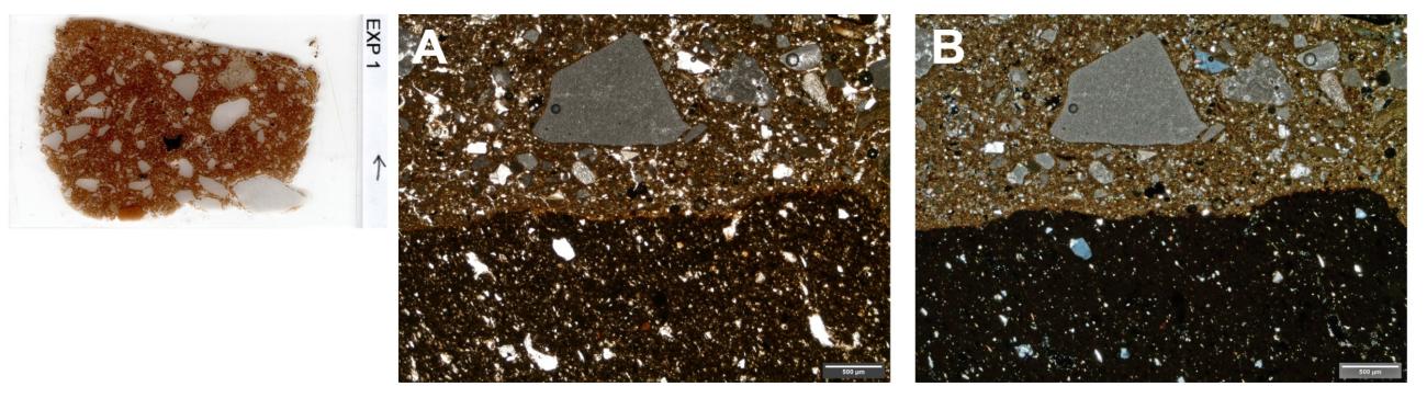 Both samples from the trampled area (EXP 1 and EXP 2) show microstructural modifications which include compaction and lack of voids caused by trampling. This contrasts with the soil in the control sample of EXP 3 which is much more porous and presents frequent packing voids and chambers (See Figure 8). Furthermore, effects on coarse components in the two trampled samples were also visible. These include the vertical downwards movement of coarse fragments (up to 5 cm) due to soil pressure and compaction (See Figure 9a and b). Some of the bones and pottery fragments appear to be crushed.