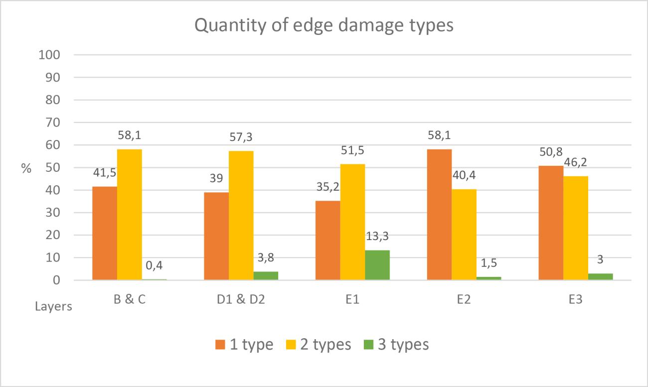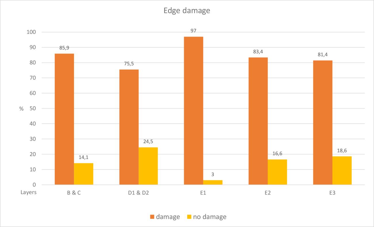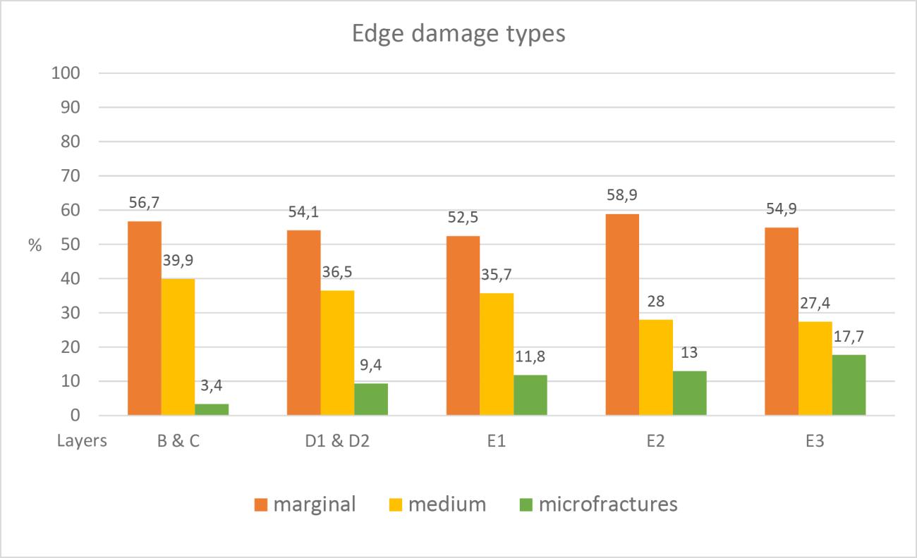 During the analysis, we used a system developed by Villa and Soressi (2000, p.202). They described three different edge damage categories according to size: marginal (scars 1.5 mm), medium (scars 1.5 – 4.5 mm), and microfractures (edge break without a bulbar scar). We also recorded breakages and damages bigger than 4.5 mm (chipped).