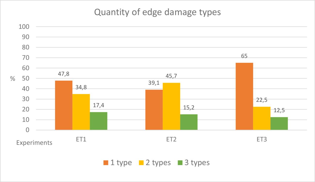 Out of 40 artifacts from the first experiment, 23 presented edge-damage (57.5%). Experiment 2 produced 56.1% of edge-damaged pieces, whereas experiment 3 produced 49,4%, which means that trampling on soil in this instance produced the smallest percentage of edge-damaged artifacts. Regarding edge damage types (marginal, medium or microfractures), artifacts trampled on debris (experiment 2) presented 40.7% of medium edge damage (1.5 – 4.5 mm in size), whereas experiment 1 and 2 presented 21.2% and 25.5% respectively. All three groups of experimental artifacts exhibited marginal damage (1.5 mm) as the predominant type. Experiment 2 also produced the biggest number of pseudo-tools – 13 (15.9%), compared to six pseudo-tools from experiment 1 (15%) and 9 pseudo-tools (11.1%) produced during experiment 3. However, experiment 1 only involved 40 artifacts, whereas experiments 2 and 3 involved double the amount (80 pieces).