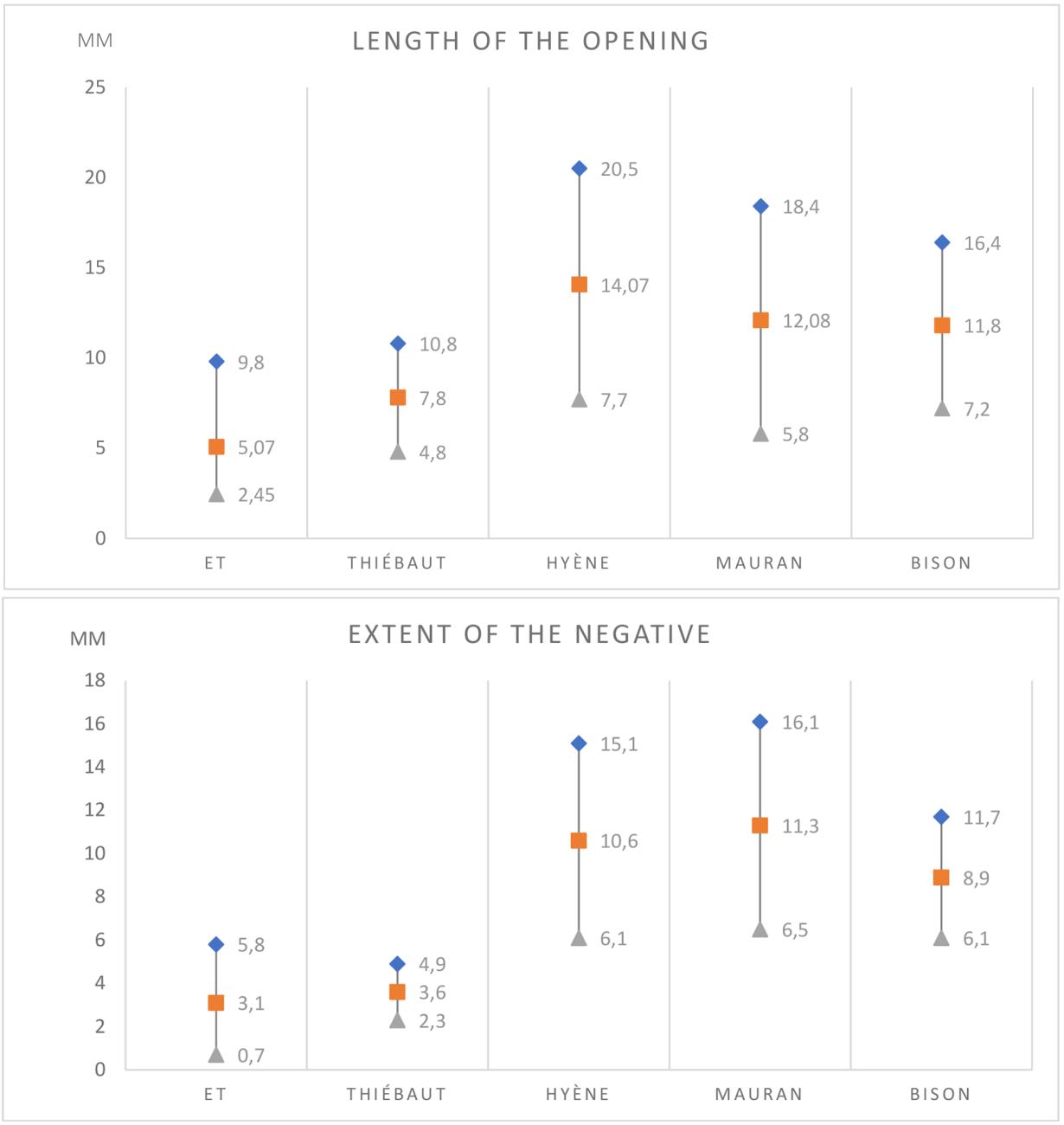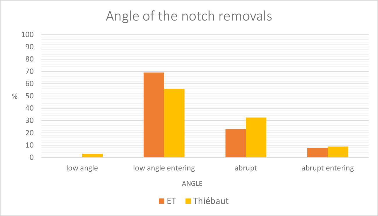 Regarding the length and the extent of the opening of the notch, both groups of pseudo-notches again show similarities, and stand out when compared to Thiébaut’s analyses of archaeological material (See Graph 8). The average dimension of the openings and the extent of the negatives from the pseudo-tools are lower than those of the notched artifacts from archaeological sites. The negatives on Thiébaut’s pseudo-tools and those on our assemblage are therefore also smaller.