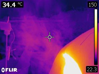 Viewing the whole experiment, the temperature on the outer sides of the dome walls develops only very slowly, almost constantly and is relatively independent from the variations in the other measured data. It rises to a maximum of 36.4 degrees, twice as much as its initial temperature. During the night´s rest it falls by a third to 20.3°C, just slightly exceeding the figure at the start of the experiment.