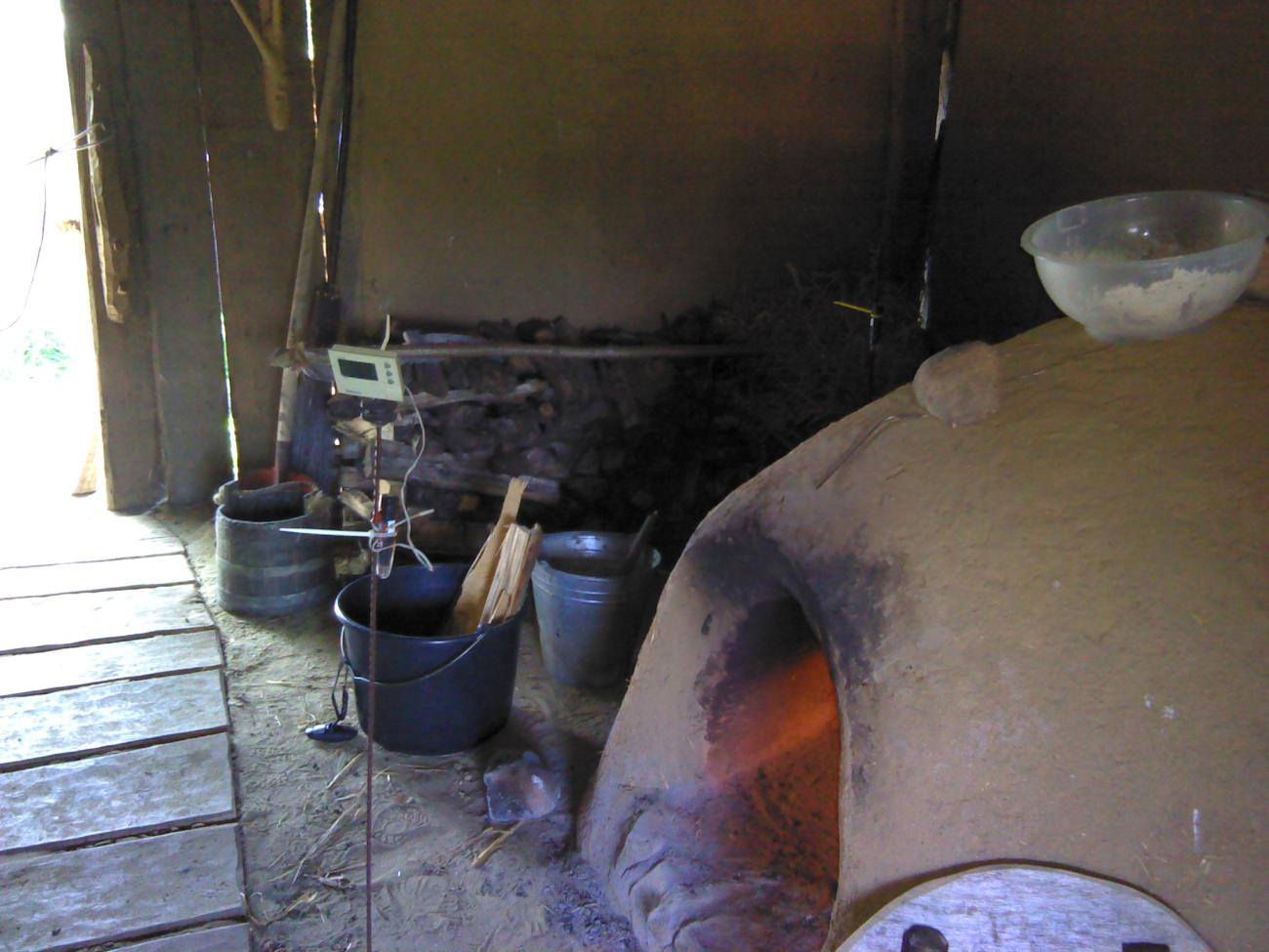 An oven can be used in different ways. During this experiment the embers were totally cleared out, and the bottom plate was cleaned by sweeping and wiping with a wet piece of fabric attached to a wooden stick, thus taking up remaining ashes and tossing remnants of the embers to the oven´s inner edge.