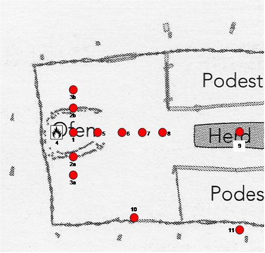 At the points of measurement besides the oven and above the dome no considerable deviations from the common room air temperature can be noted. The dome hardly gives off heat, the differences to the room air temperature are marginal. The quick heat rise during the firing phases at a distance of 50-100 cm directly before opening the oven corresponds with the measured data right above the chimney. The escaping heat rises quickly and concentrates under the hide, which was attached above the oven as a protection against flying sparks, and in the roof truss of the house (See Figure 7 a, b). The temperature drop during the night´s rest phase is most affected by the decrease in the outside temperature. All values progress at a similar rate (See Graph 2).