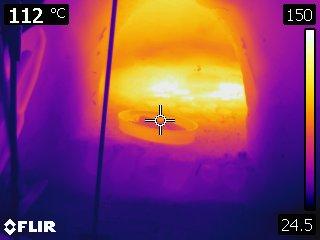 The heat escaping from the chimney, measured directly on top of the dome above the opening, peaks between 59 and 64°C and oscillates around 40°C for the rest of the time, depending on the size and the heat development of the fire inside the oven. This shows how much heat escapes and is lost.