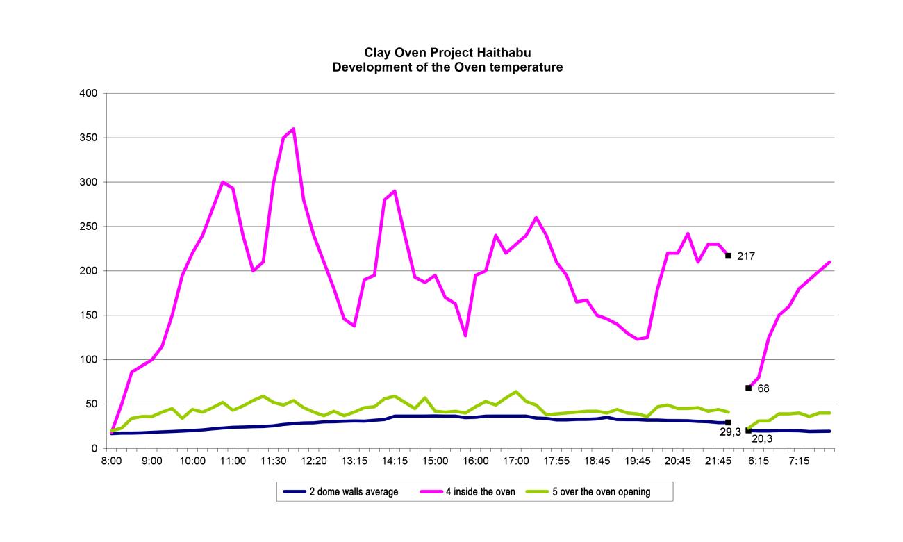 During the entire experiment 45.1 kg of lime wood were burnt. The value for the energy produced by lime wood is an average 4.1 KWh per 1 kg of wood. Thus, the wood consumption produced an energy total of 184.91 KWh. Drawing conclusions from this result is not useful, because we are short of adequate opportunities to compare with other ovens. The question of the efficiency of this kind of oven has to remain unsolved for the moment.