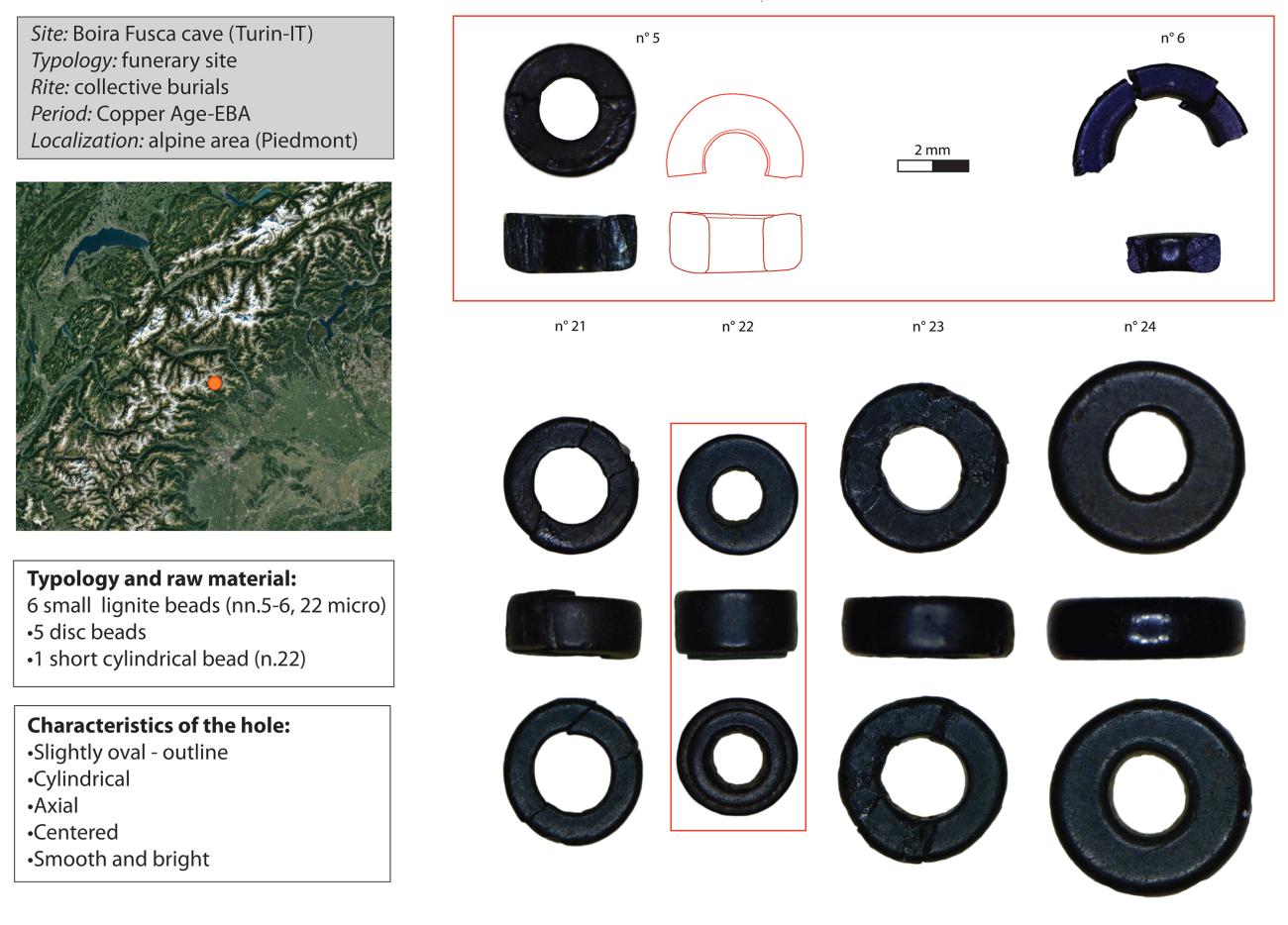 The cave’s find assemblage is kept in the Museo Archeologico del Canavese (Cuorgnè, Turin) and consists of 6 lignite beads, of which five are disc beads (nn. 5-6, 21, 23-24) and one a short cylindrical bead (n. 22); all of them are small in size (in particular nn. 5, 6, 22) (See Table 1).