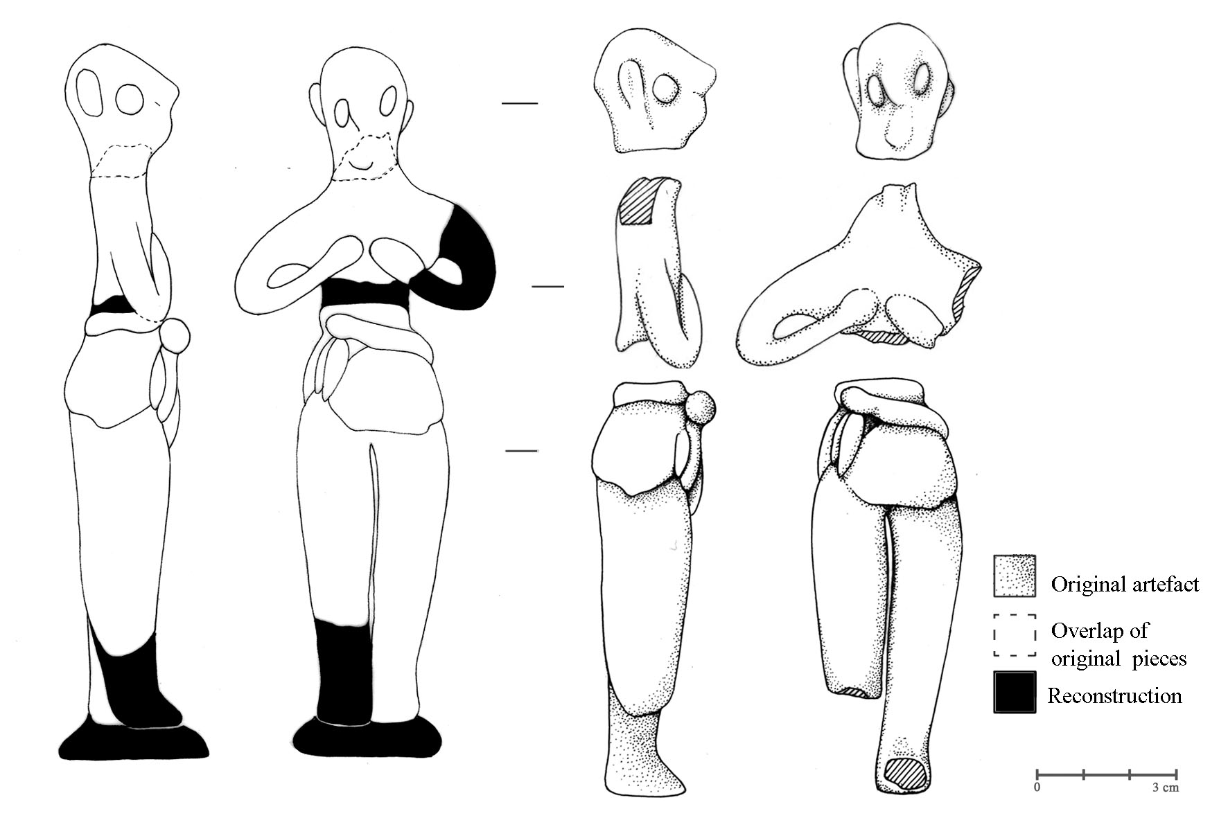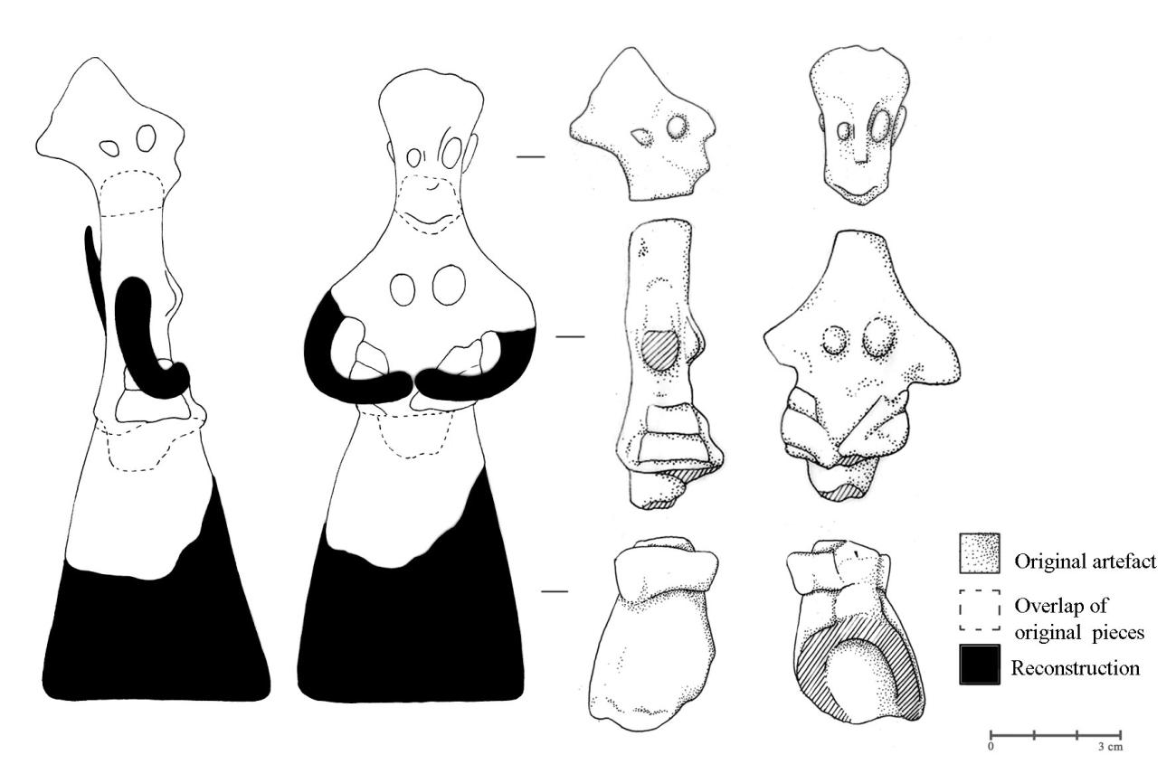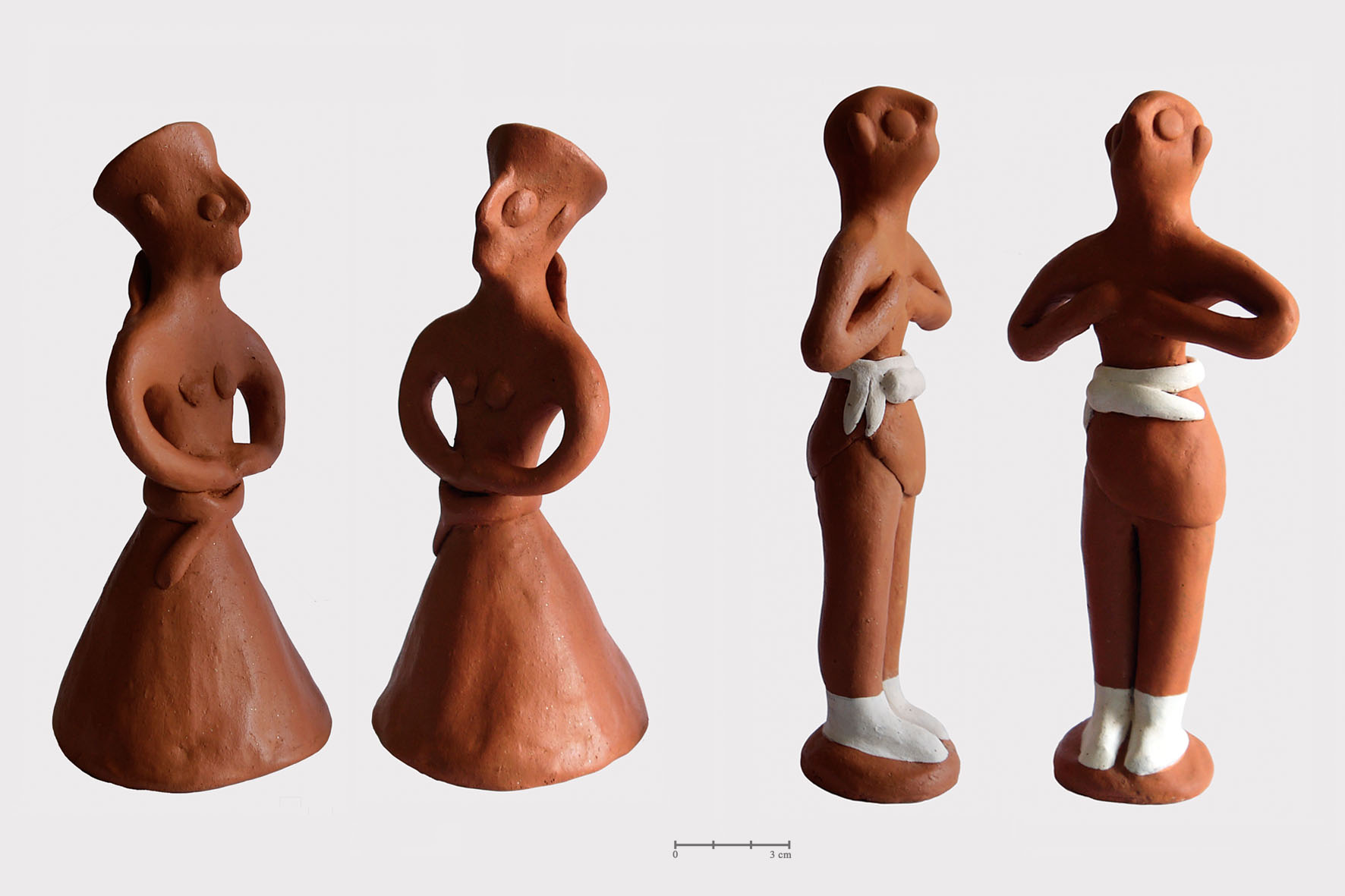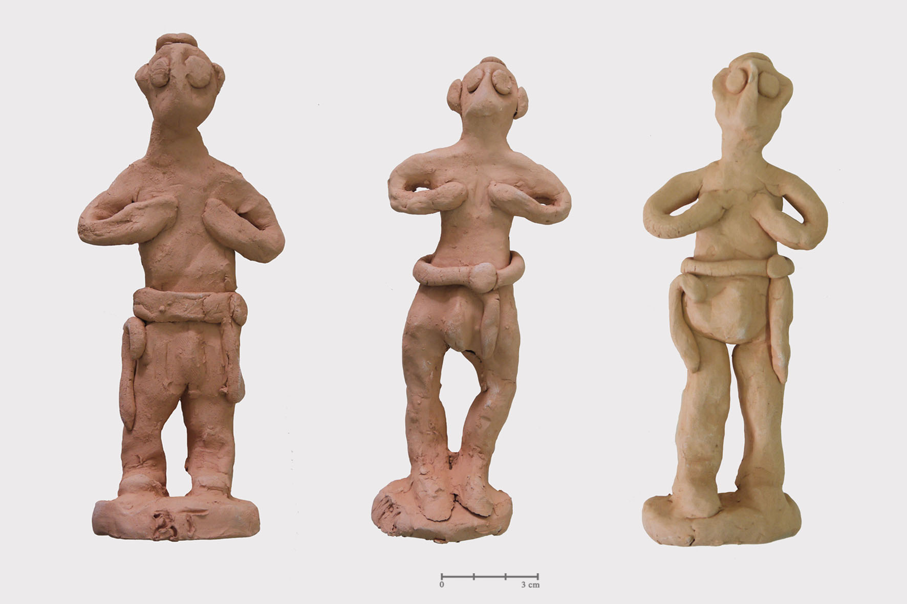 Repeated experience with replicating small to medium-sized figurines allowed me to note that in reality the techniques employed in the objects’ construction only require a very limited set of gestures and that the latter are repeated for different purposes throughout the process. These gestures consist of rolling, smoothing, pinching and pushing clay. Moreover, it appears that assembling techniques are also recurrently used for different pieces (e.g. zoomorphic and anthropomorphic, male and female). Consequently, it is noticeable that although the female figurines flaunt a more complex appearance than the male figurines, their creation actually involves the same types of gestures. Accordingly, it is important to remark that as well as crafting my reconstructed pieces with the same techniques, I also attempted to meticulously replicate traces – apparent on the original artefacts – indicative of manufacture methods, such as finger impressions, on my copies.