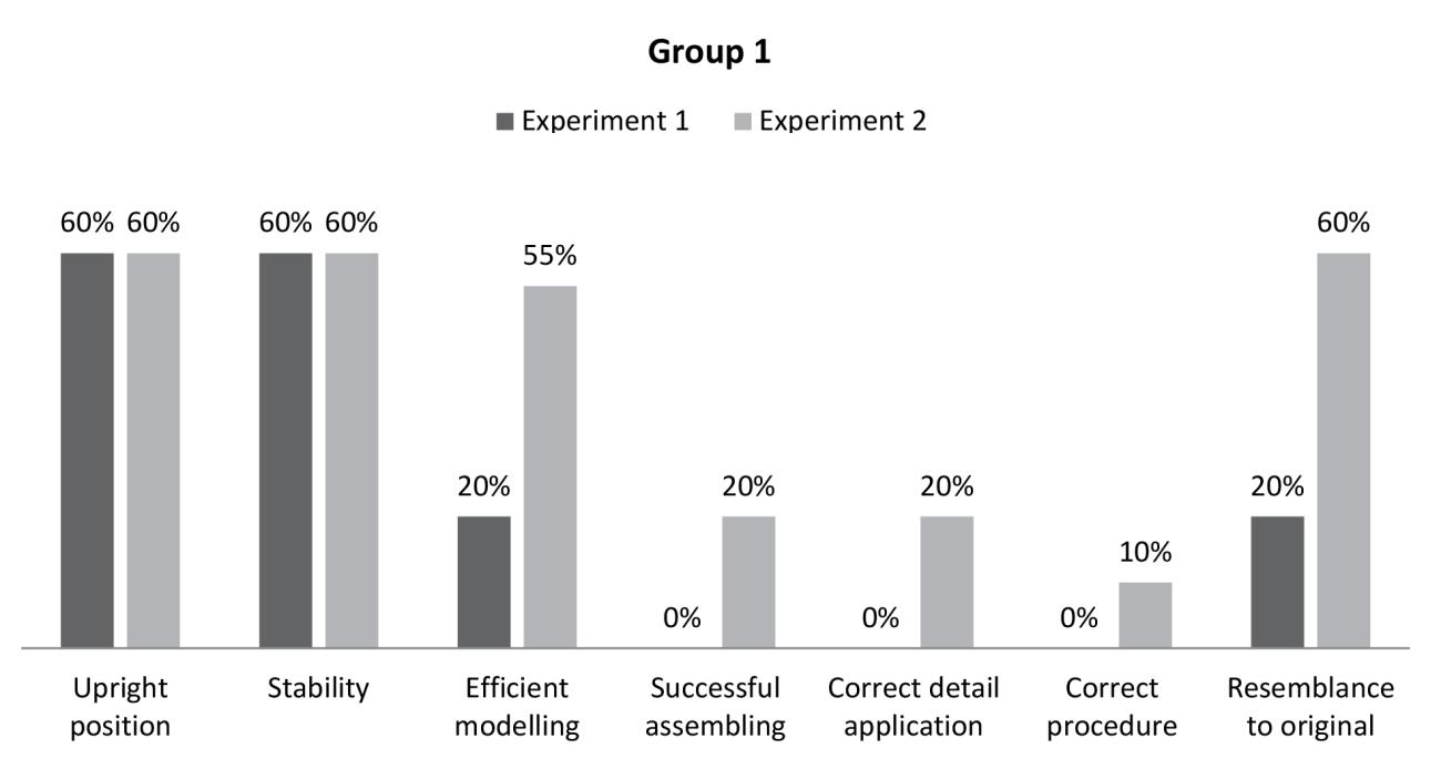 The way in which the participants’ performance was recorded was through a graded system ranking from 1 to 5. It must here be noted that the grades were attributed to the participants’ work in consideration of the fact that they were all novices. Learning a craft is not a simple process, but rather a complex one which requires time (Wendrich, 2012; Høgseth, 2012; Knappett, 2016). If the experiment had been undertaken with experienced participants, the grading would have been different. As an additional recording measure, each participant was required to briefly comment on their experience with special attention placed on how they felt in regards to the tasks’ difficulty, if they felt inclined to make more figurines following their first experience and if they believed they could improve their performance.