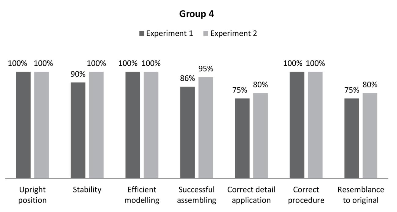 As was expected, the experiments carried out with Groups 3 and 4 yielded better results than those undertaken with Groups 1 and 2. Having been attentive to the instructions and demonstration provided, the participants successfully produced structurally and visually sound figurine copies. Interestingly, in contrast to the participants of Groups 1 and 2, the participants of Groups 3 and 4 expressed less concern with the neatness of their figurines’ appearance as they did with the accuracy of their construction, although their copies’ appearances were all very acceptable. An evident increase in attention to and success in the rendering of surface detail was nevertheless noted during the second round of experiments with Groups 3 and 4. Participants clearly improved in their performance through practice (See Figures 9 and 10 and Graphs 3 and 4). Direct teaching established the context and situation in which individual learning could take place and effectively set the terrain for the participants to become knowledgeable. It must, however, be noted that the creativity and imagination of participants of Groups 3 and 4 were less prompted than those of the participants of Groups 1 and 2. Rather, participants were cautious to fit within the experiment’s defined requirements. Aptitude for the task nevertheless also became evident in the way some participants intuitively understood how much wet clay to apply to the joining sockets and how to render the figurines’ facial features. Overall, the students expressed satisfaction with both their method of instruction and their own performance and productions.