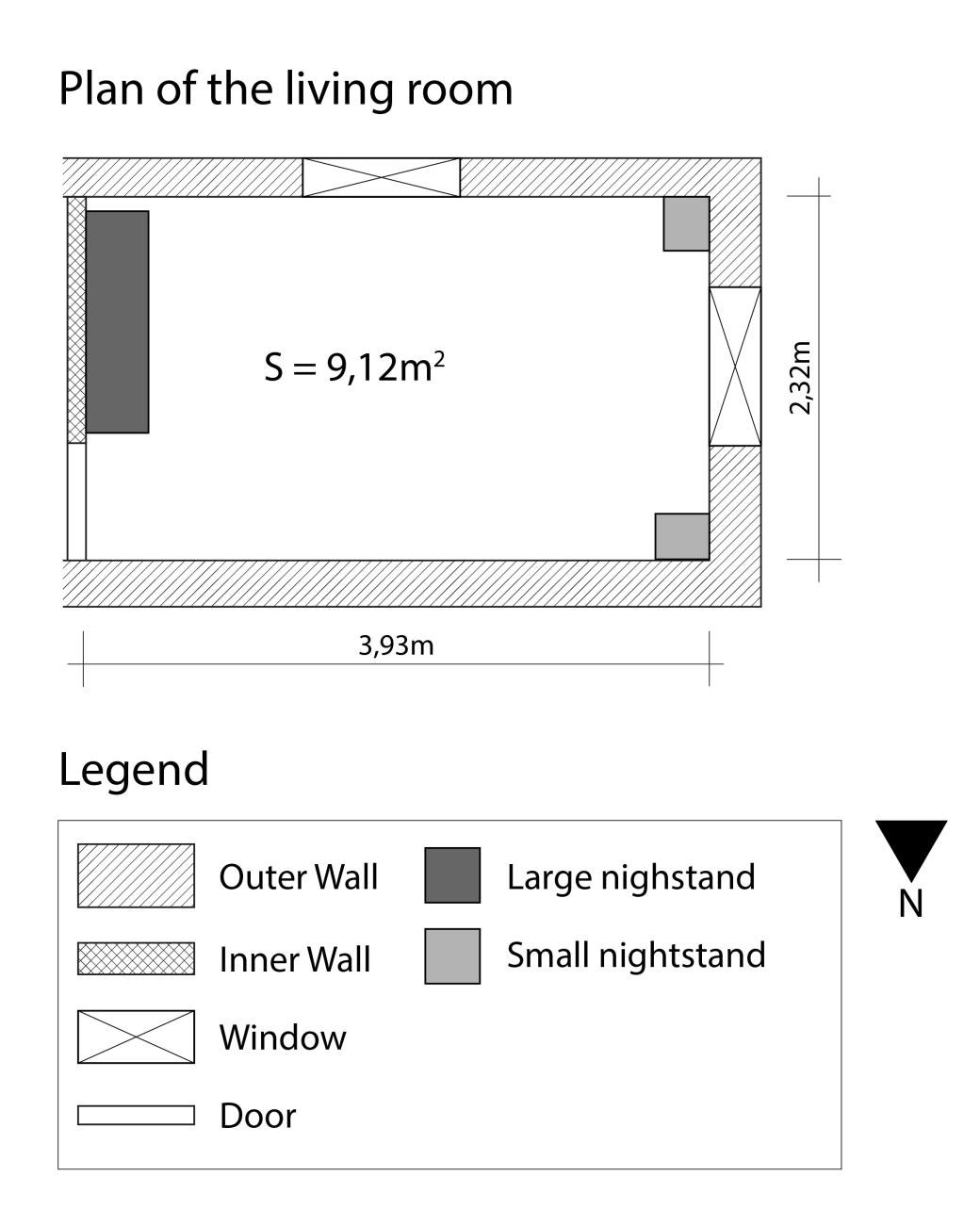 Today’s dwellings are not so different from ancient living rooms or dining rooms. The living room plan presented below (See Figure 1), has a rectangle shape with a size of 2.32m X 3.93m, for a total living area of 9.12 square meters. The room has two small nightstands, one big nightstand and two windows. The layout does not indicate the location of the living room relative to the external world, since the experiment was conducted inside the home and did not consider the wind, which may have affected the burning time.
