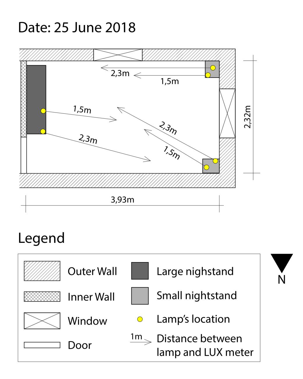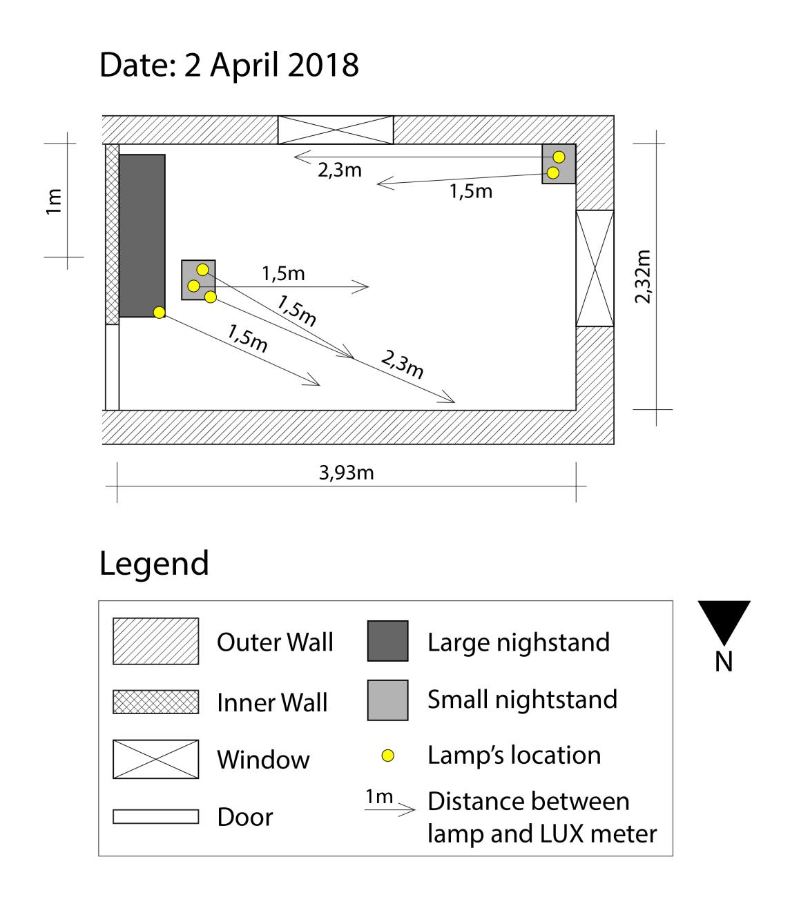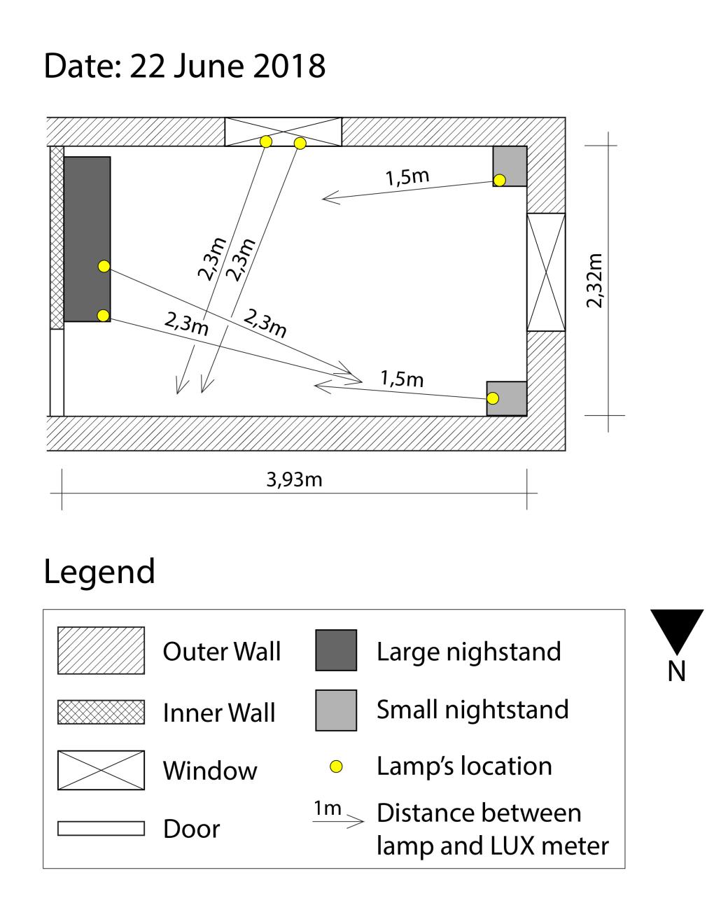 As seen in the lamp location plans (See Figures 2, 3 and 4), each time the lamps were in different places in the room. However, the intensity of light was measured identically each time, with a lux meter.