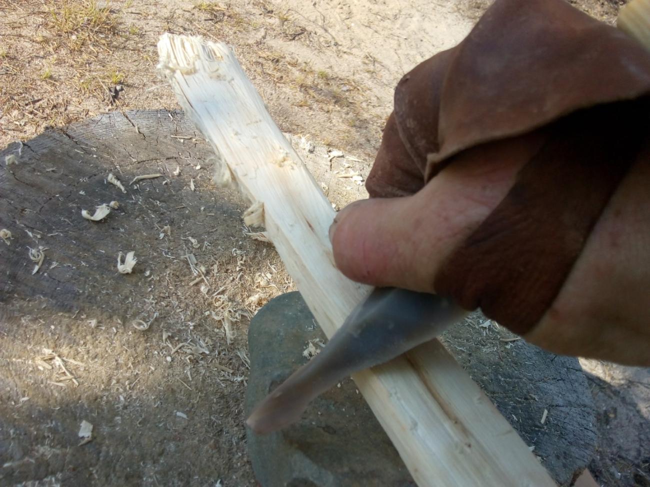 Once rough shaping was complete, the slate wedge and various flint blades were used to remove smaller amounts of material and focus on a uniform taper. At this stage, knots were also carefully carved down, but an excess of material was left around these fundamentally weak points of the bow to compensate.