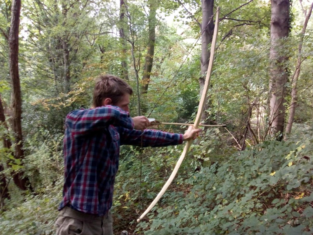 Willow was refused as being too pliable and not very springy, thus the limbs would have had to be thick and long to achieve even a moderate draw weight. It also has a naturally weak pithy middle. Aspen and alder are too soft and not very dense, their properties totally unsuited to withstanding the forces a bow is subjected to. Birch, although strong, dense, and good in compression, tends to lend itself better to laminated bow designs to improve tensile strength but it could have been a viable option. Pine and Spruce were rejected for being fast-growing softwoods, whose cells don’t stand up to compression and tension. They also harden over time due to a high resin content, causing brittleness. Juniper could have been a reasonable choice as its heartwood withstands compression well and the sapwood stands up to tension, but none of satisfactory size was found nearby.