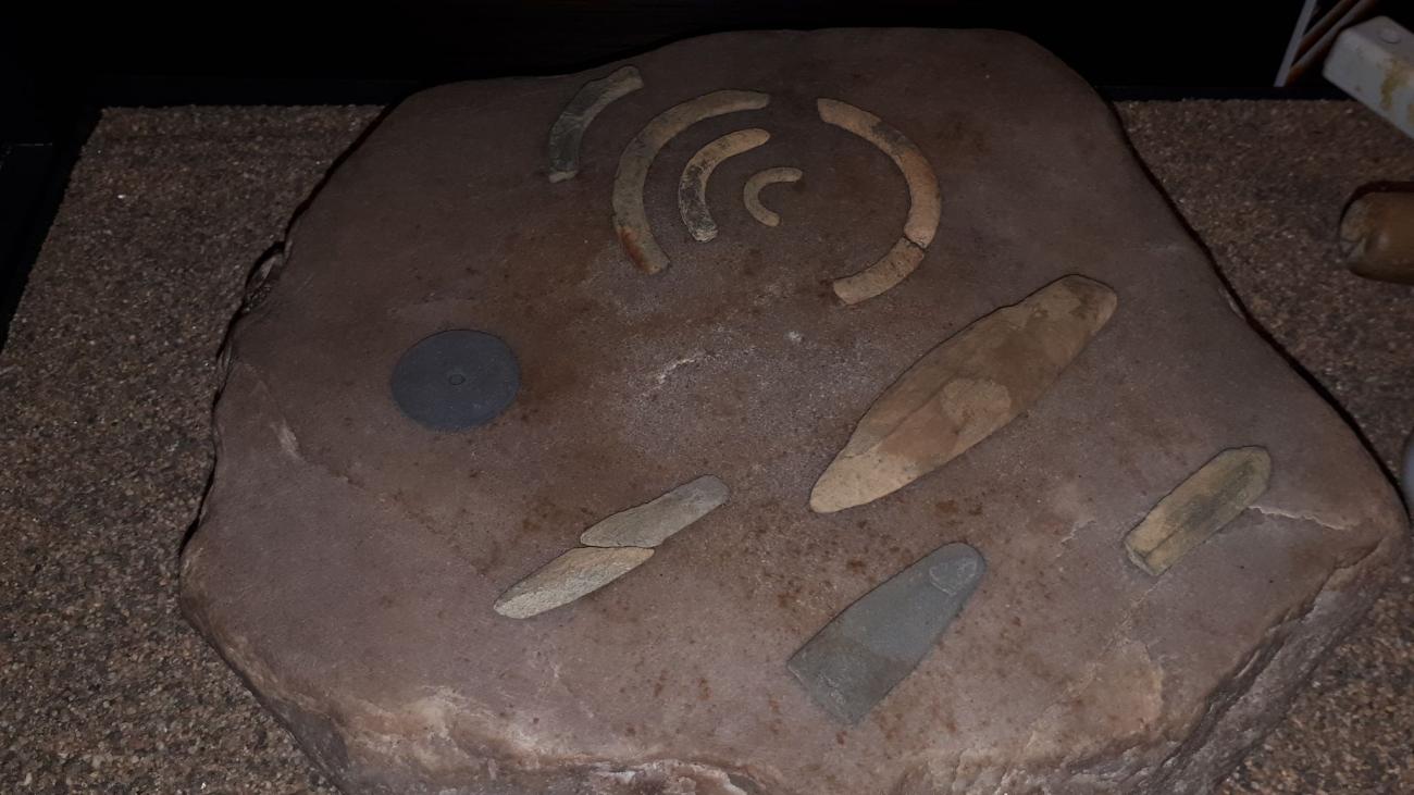 Several tools were identified by the bowyer as being essential for the project, and it was decided it was worth investing the time to produce these custom tools before beginning the bow building. Through inspecting the site’s museum collection of slate wedges chisels, axeheads and flint blades (See Figures 1 and 3) and also thinking about the Neolithic equivalents of modern bow building tools, the most promising were identified. The slate wedge, as a rough cutting and shaping tool, the slate scraper for debarking like a drawknife and fine flint blades for finer shaving work.