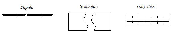 The basic functional principle of the symbollon, the stipula and the tally stick was the creation of two identifiable parts, two halves forming a portable contract with a chance for the owner to submit his right to demand a service or payment. The owner’s half of the symbolon, stipula or tally stick could function as money (a credible representative of economic value) in specific social conditions.