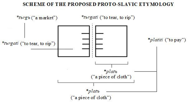 According to our hypothesis, the word *tъrgъ is also of Proto-Slavic origin and refers to the way in which *platъ was used. The Proto-Slavic verb “to tear/to rip” was *tъrgati (see Rejzek, 2015, p.708). It is nearly the same word as the noun *tъrgъ (“market”1 ).